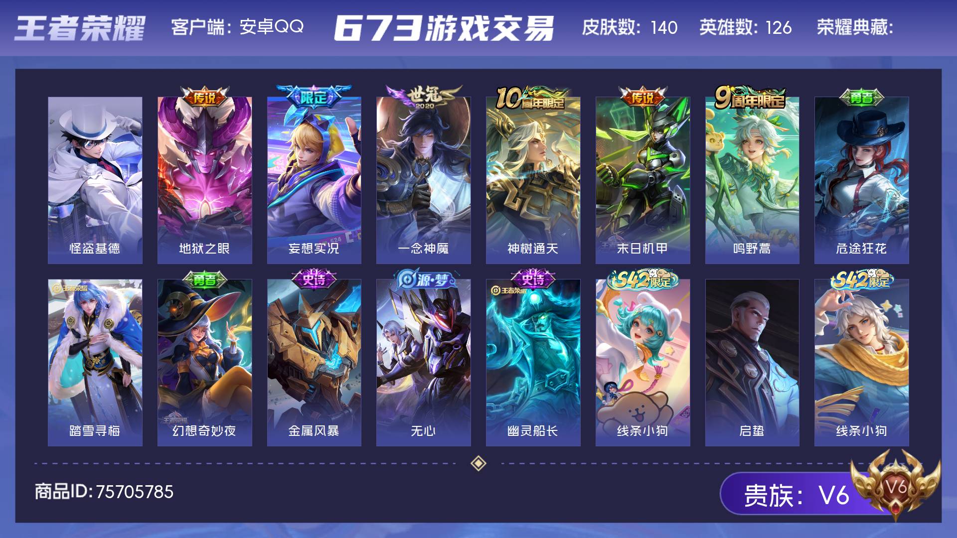 V6 皮肤140 英雄126 非凡王者 珍品传说1 星传说2 传说6 其他皮肤139