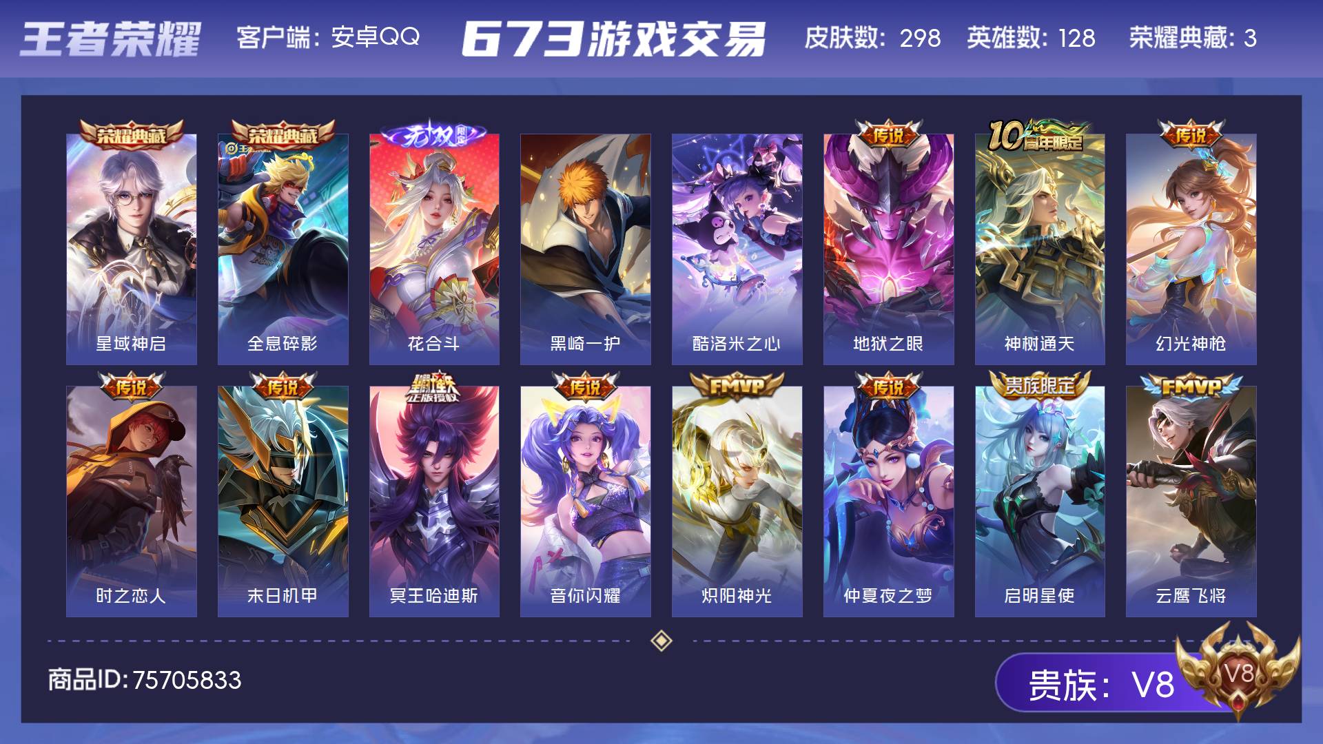 V8 皮肤298 英雄128 永恒钻石 荣耀典藏3 无双皮肤1 珍品传说2 传说15 其他皮肤284