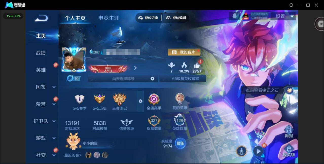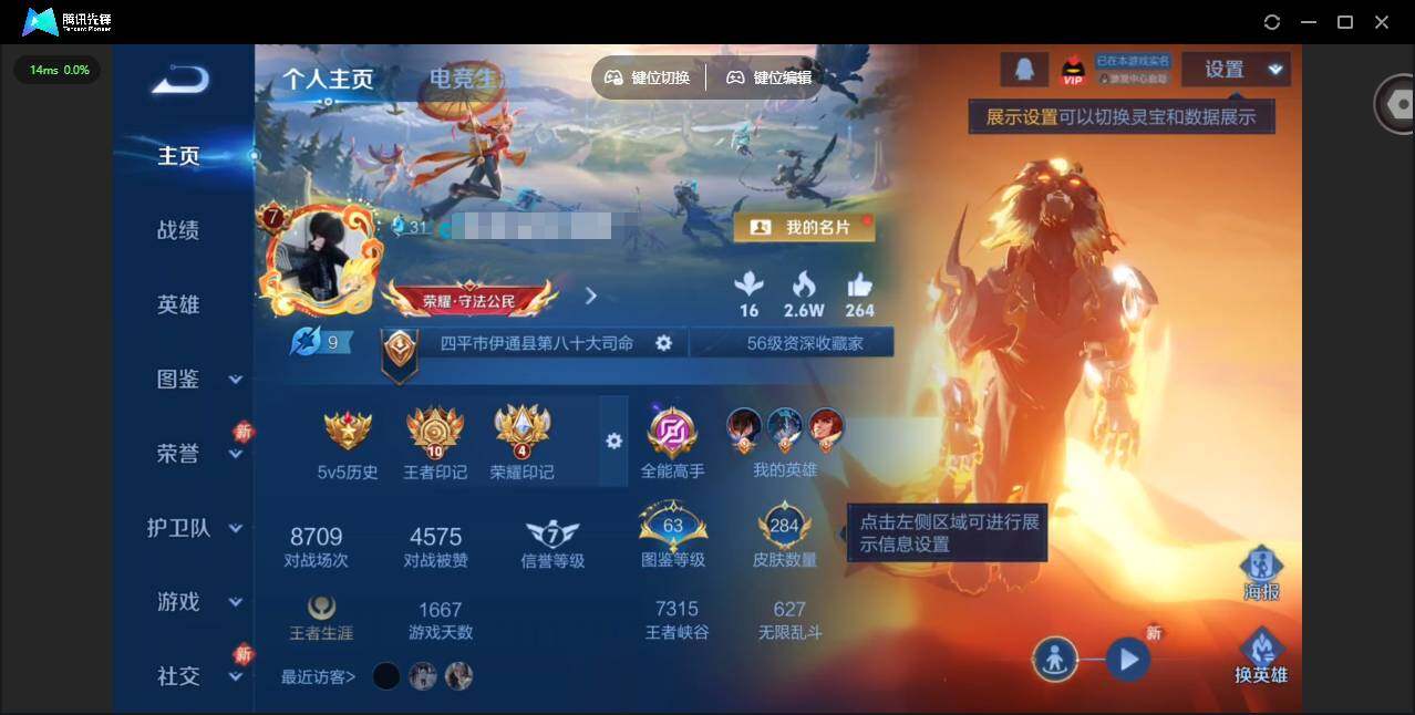 贵族等级: V7 英雄数: 128 皮肤数: 327 荣耀水晶: 九霄神辉 珍