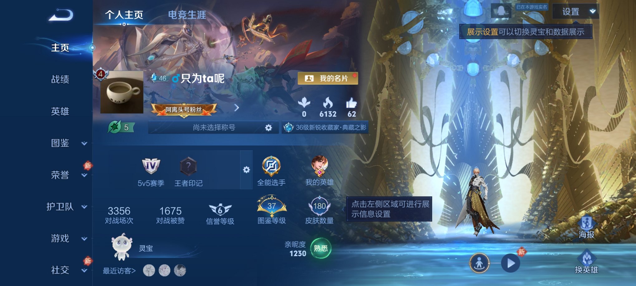 贵族等级: V8 英雄数: 127 皮肤数: 239 荣耀水晶: 拾光映像 星