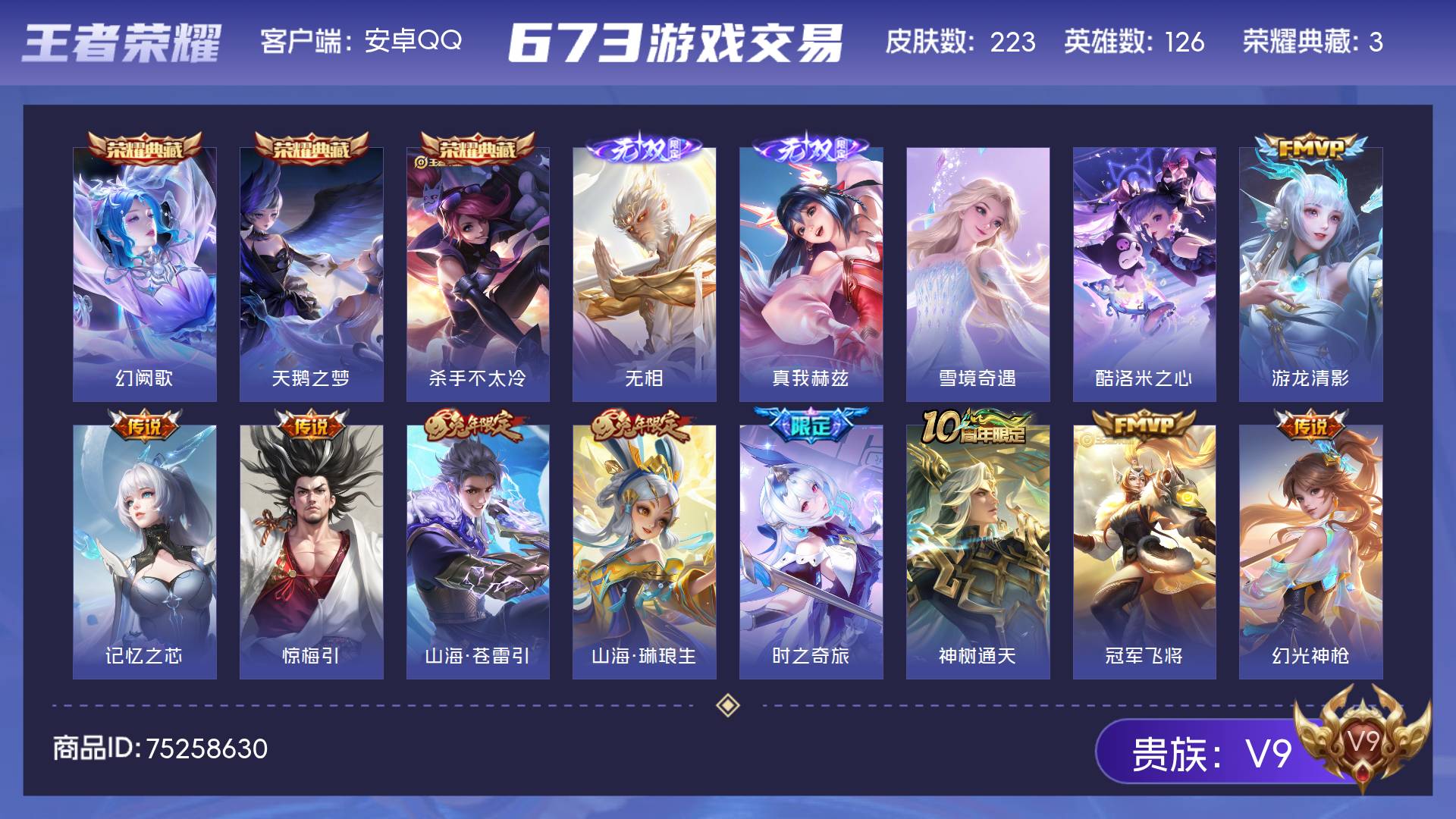 V9 皮肤223 英雄126 至尊星耀 荣耀典藏3 无双皮肤3 珍品传说1 传说25 其他皮肤197