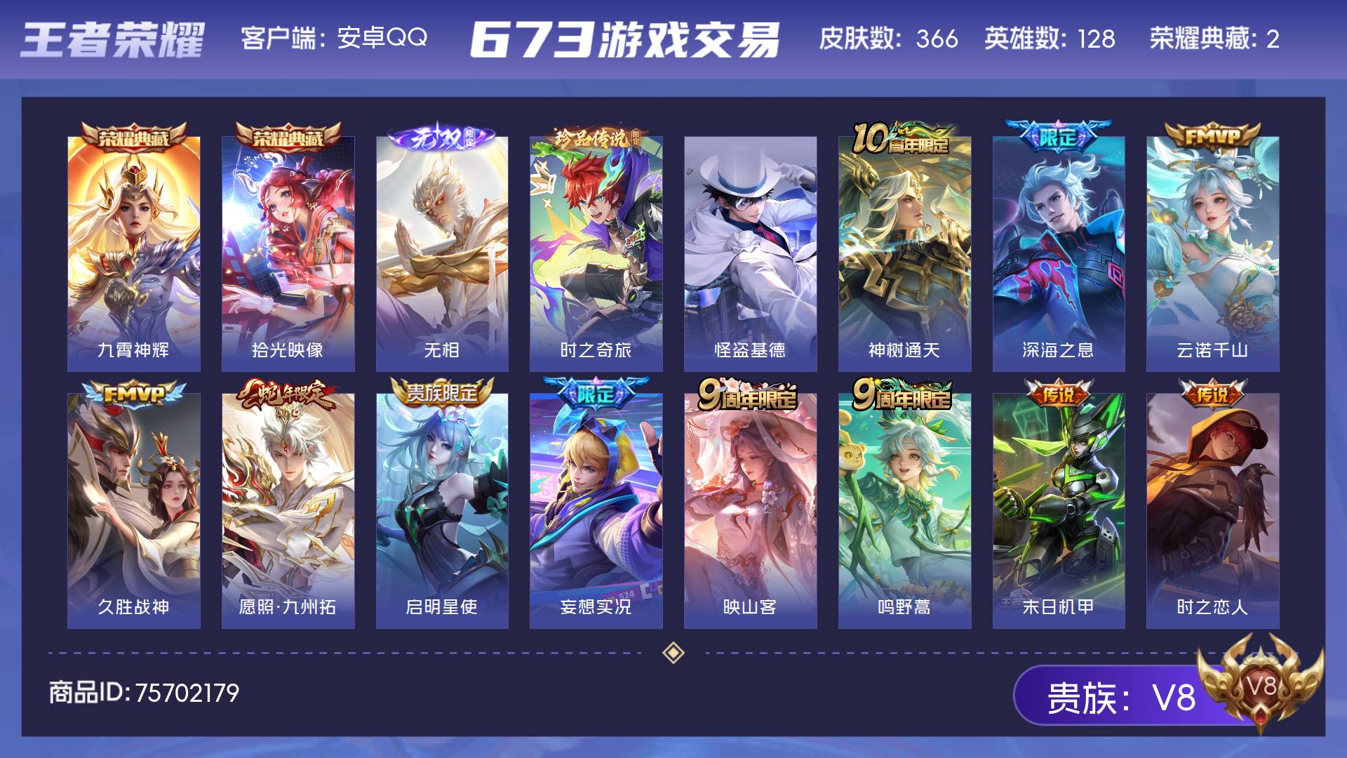 V8 皮肤366 英雄128 至尊星耀 荣耀典藏2 无双皮肤1 珍品传说2 传说24 其他皮肤343