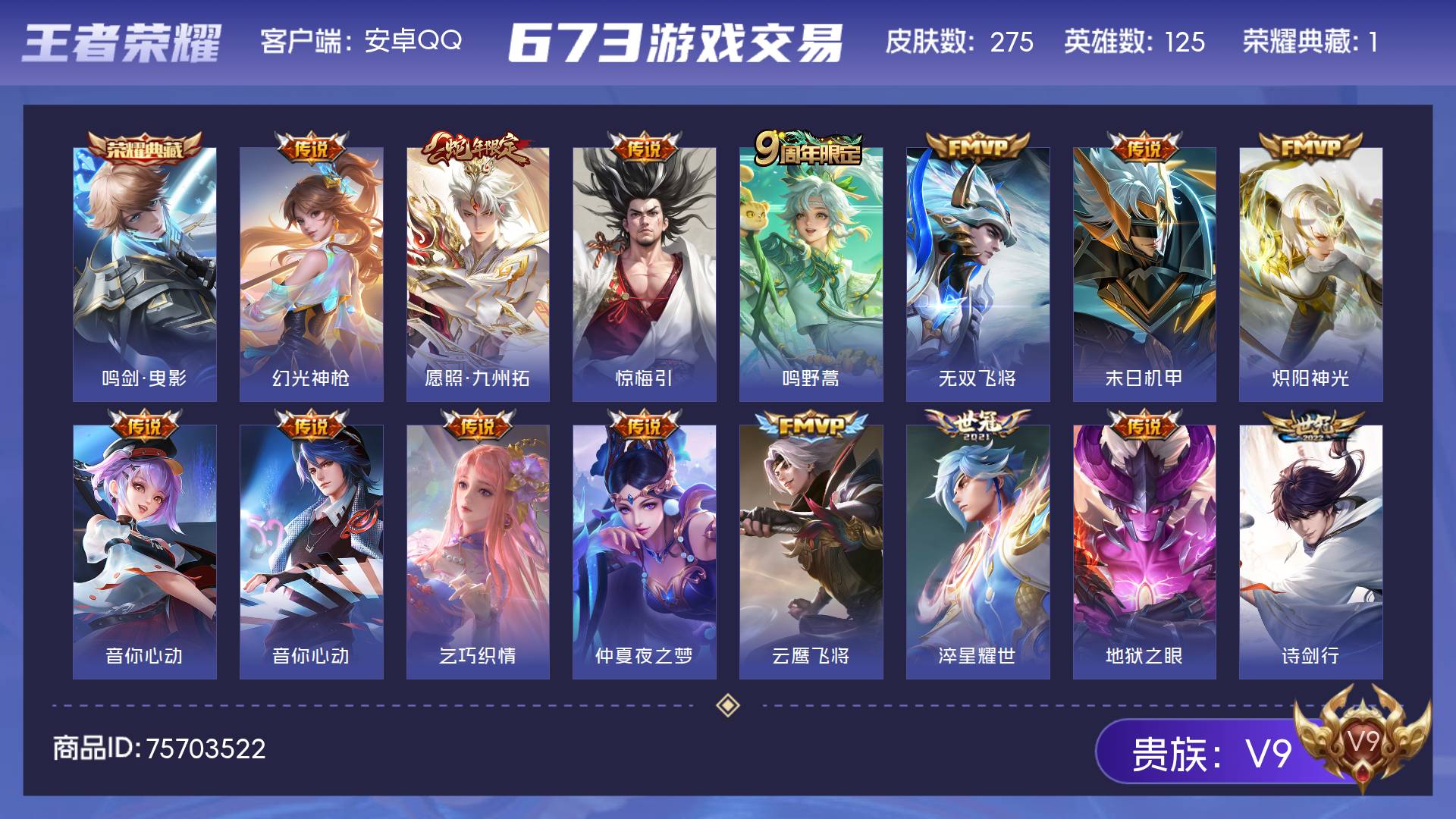V9 皮肤275 英雄125 永恒钻石 荣耀典藏1 传说27 其他皮肤253