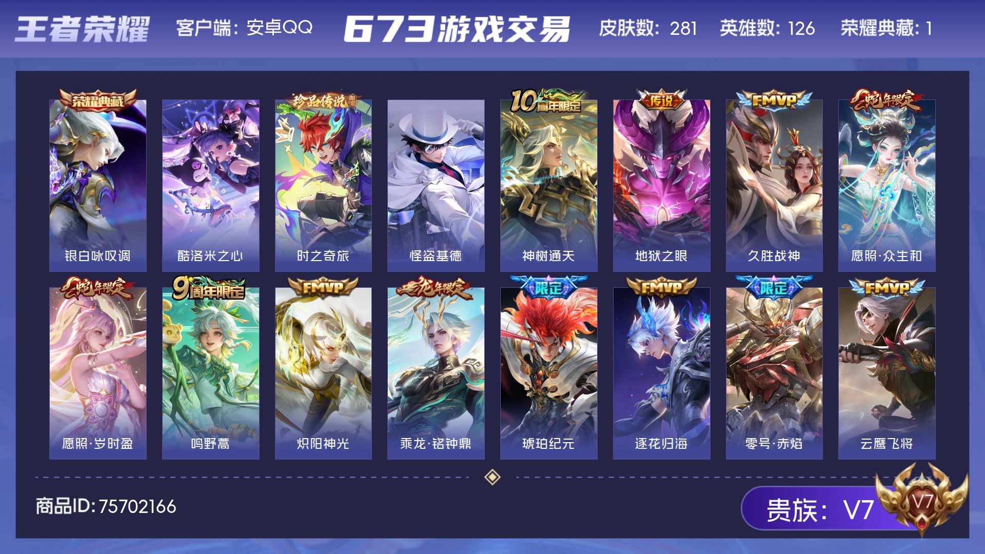 V7 皮肤281 英雄126 尊贵铂金 荣耀典藏1 珍品传说3 传说14 其他皮肤269