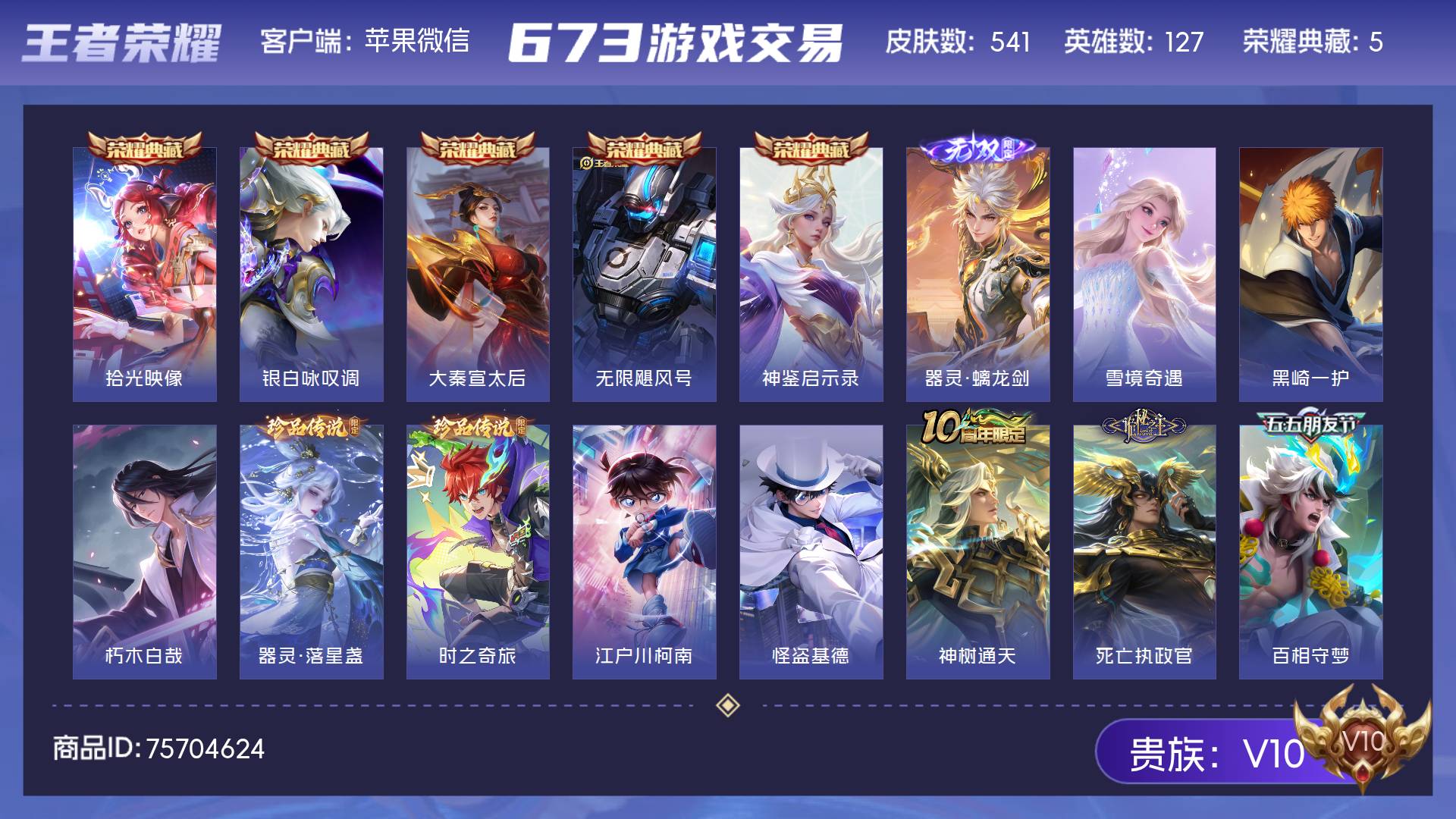 V10 皮肤541 英雄127 最强王者 荣耀典藏5 无双皮肤2 珍品传说6 传说71 其他皮肤463