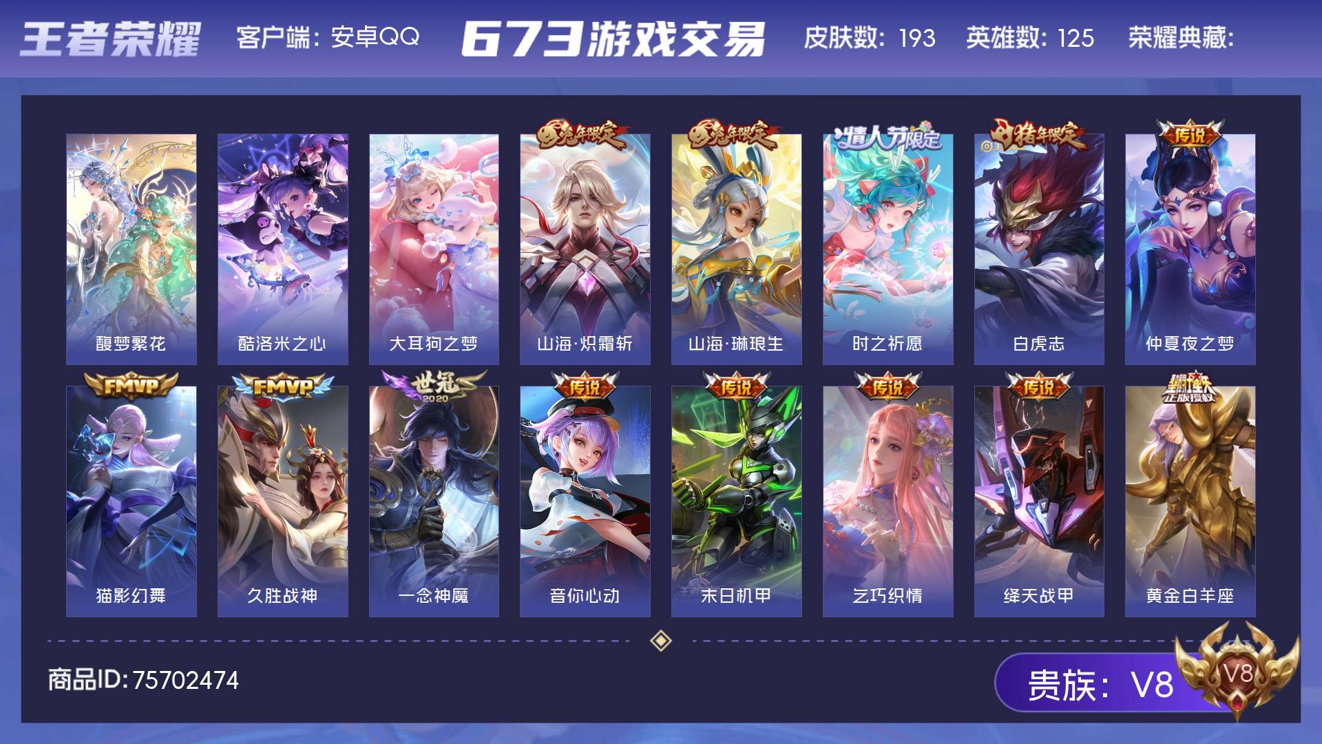 V8 皮肤193 英雄125 永恒钻石 珍品无双1 珍品传说2 传说16 其他皮肤181