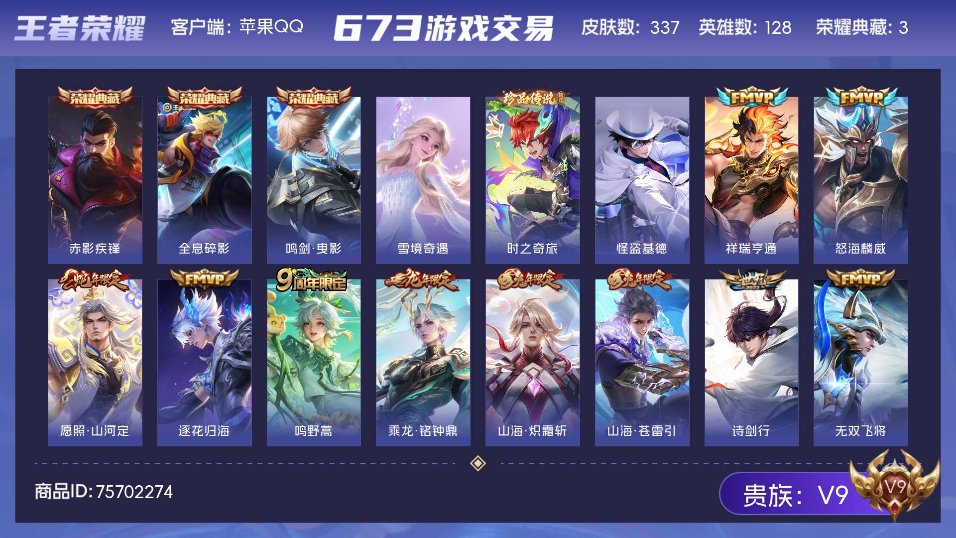 V9 皮肤337 英雄128 无双王者 荣耀典藏3 无双皮肤1 珍品传说2 传说27 其他皮肤309