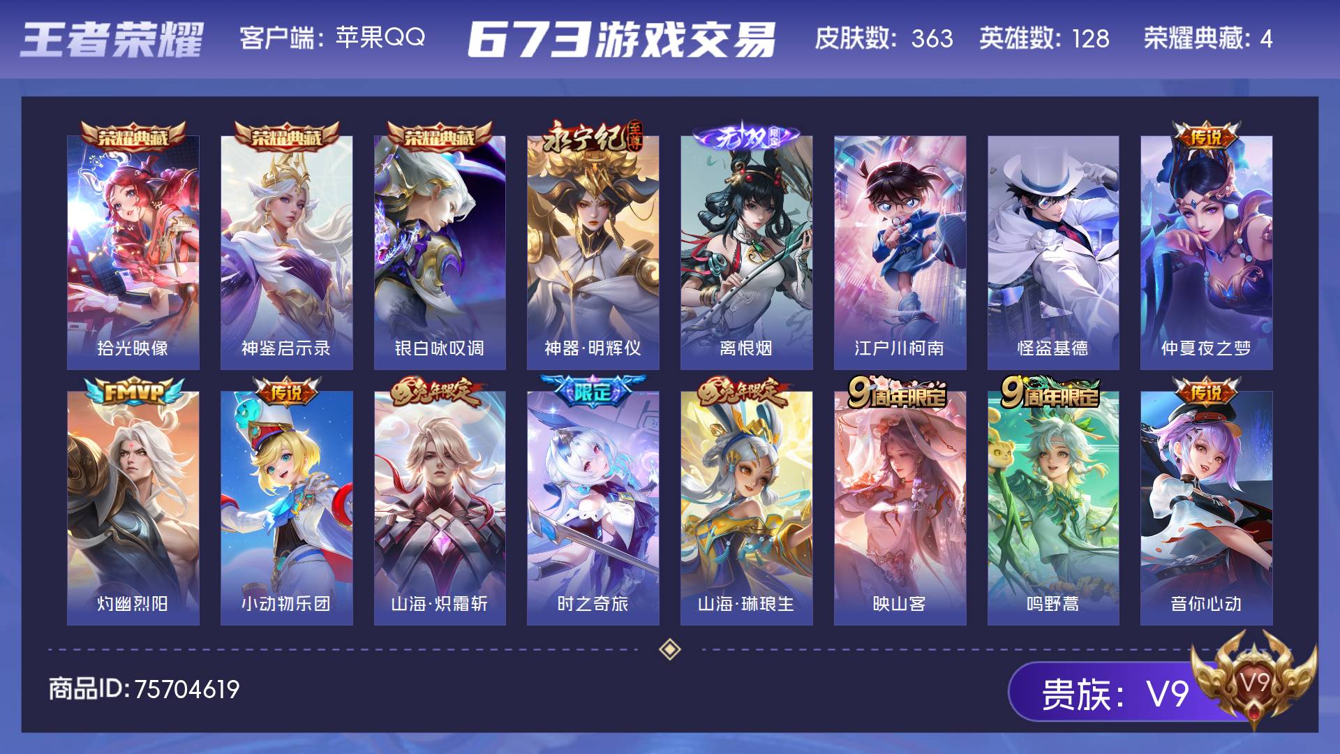 V9 皮肤363 英雄128 永恒钻石 荣耀典藏4 无双皮肤2 珍品传说2 传说29 其他皮肤331
