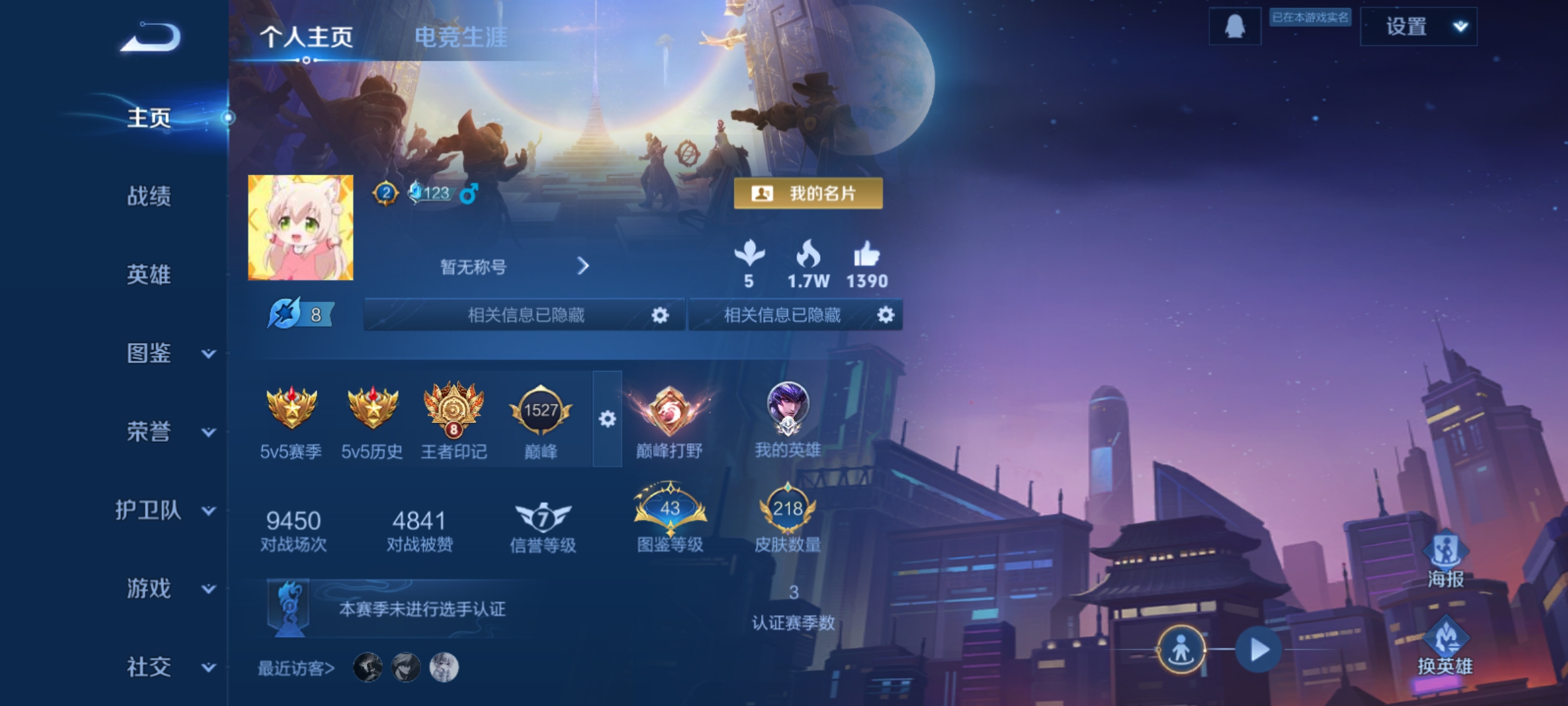 实名: 可修改 贵族等级: V7 英雄数: 92 皮肤数: 80 荣耀水晶: