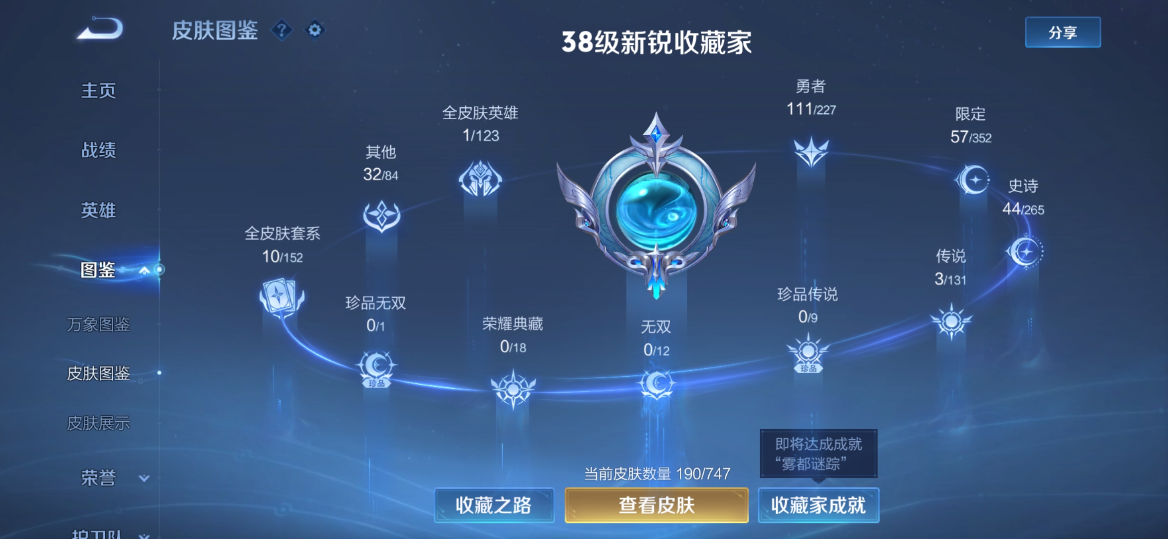 安卓QQ/至圣王者/339皮肤/127英雄/3典藏/0珍品无双/1无双/2珍品传说/22传说/98史