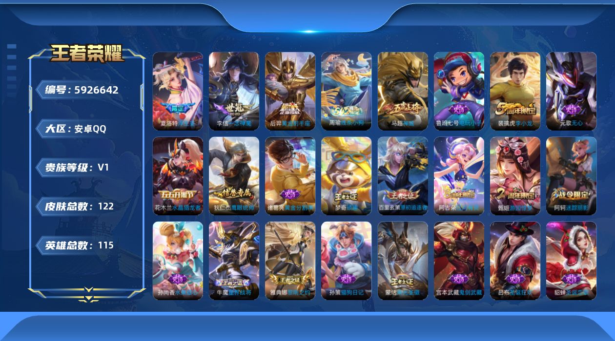 贵族5/皮肤120/传说4/史诗30/英雄122/空空儿全皮/影全皮