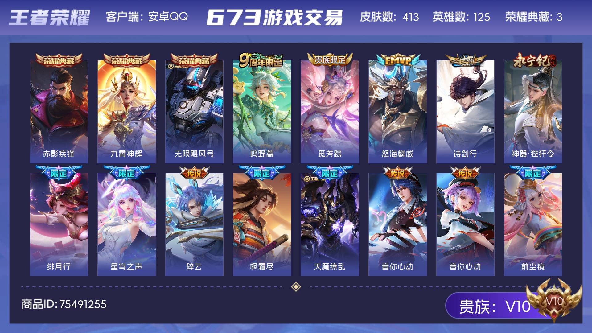 V10 皮肤413 英雄125 永恒钻石 荣耀典藏3 传说53 其他皮肤362