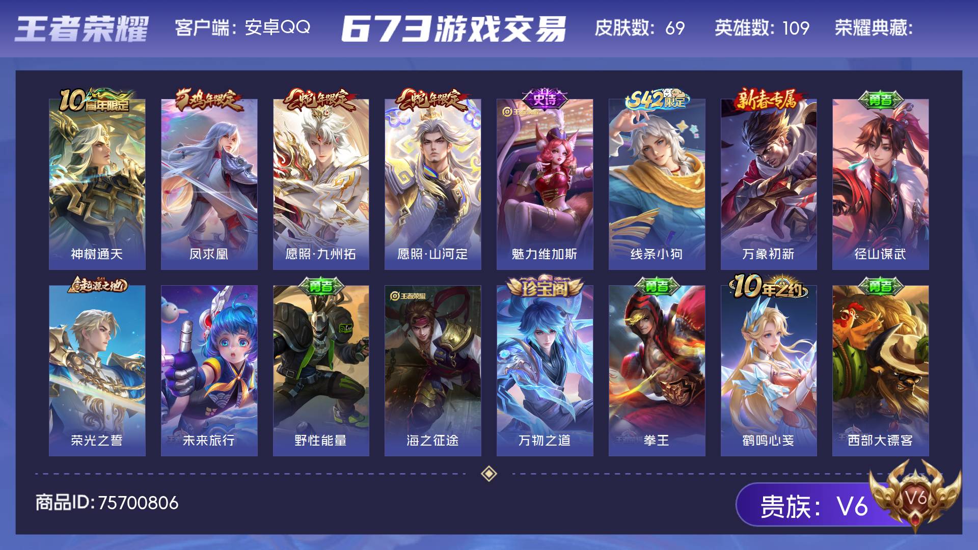 V6 皮肤69 英雄109 至尊星耀 传说4 其他皮肤70