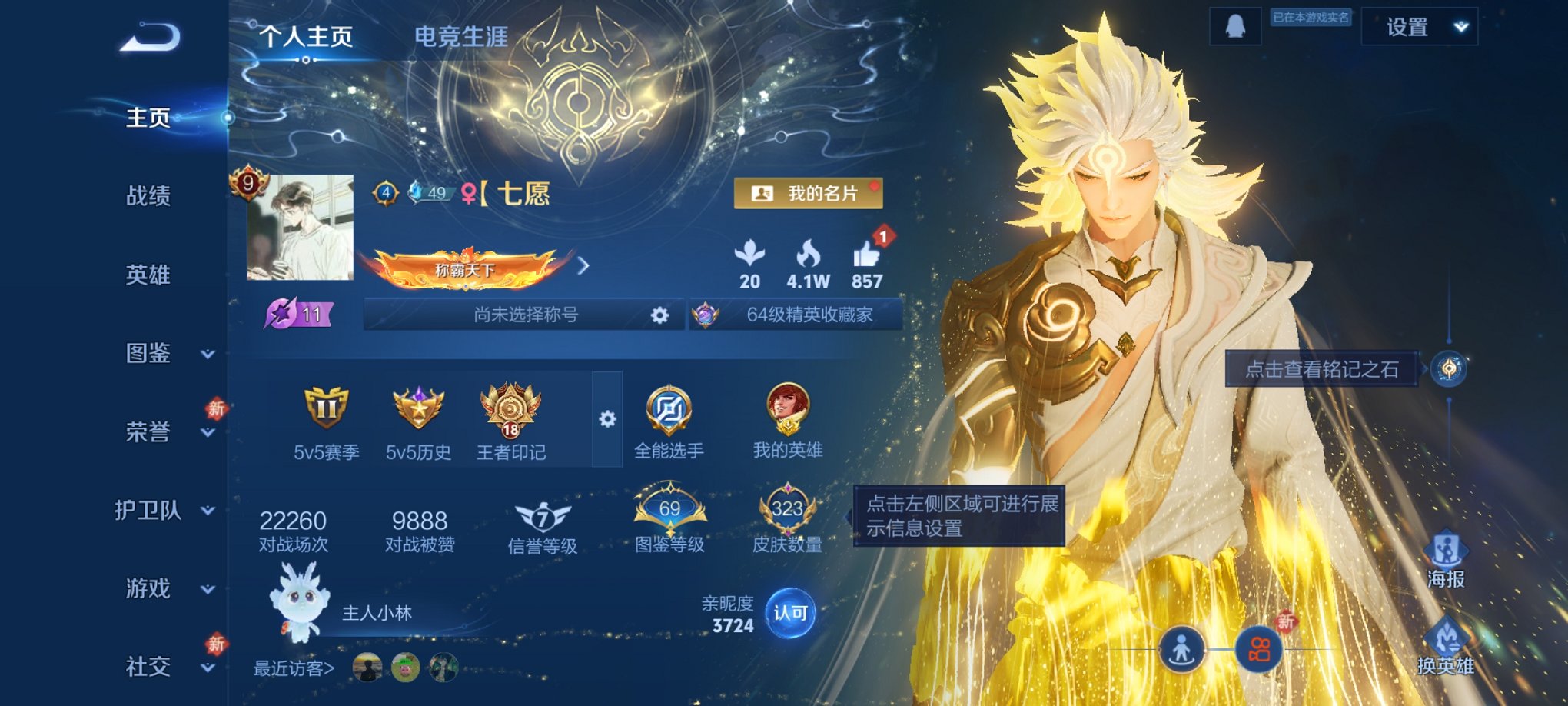 贵族等级: V9 英雄数: 129 皮肤数: 305 荣耀水晶: 武则天,大秦