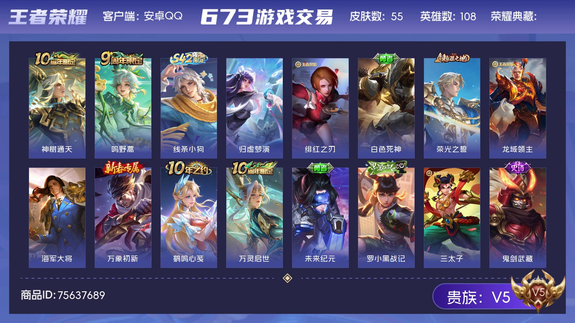 V5 皮肤55 英雄108 尊贵铂金 传说2 其他皮肤58
