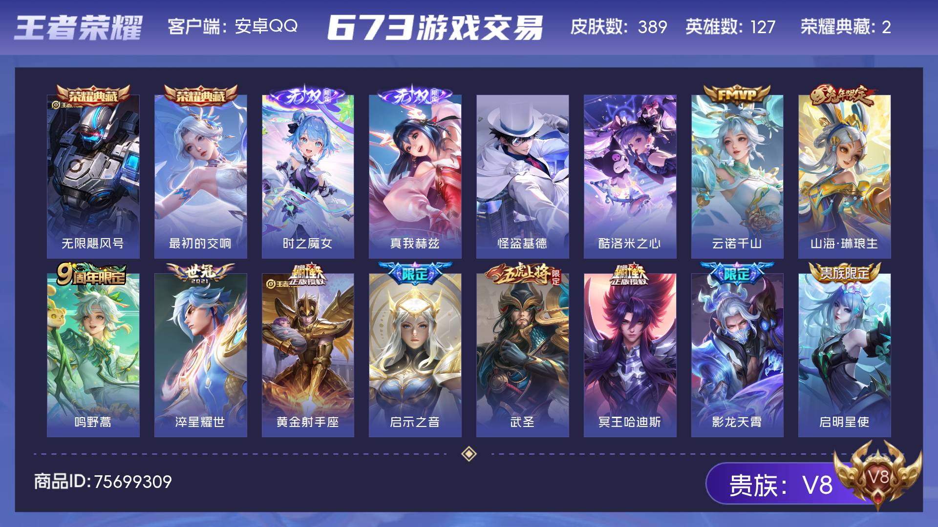 V8 皮肤389 英雄127 至尊星耀 荣耀典藏2 无双皮肤2 珍品传说2 传说23 其他皮肤366