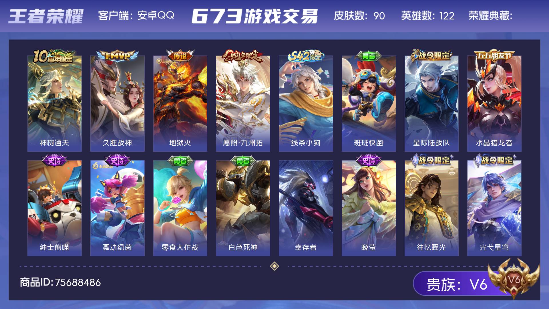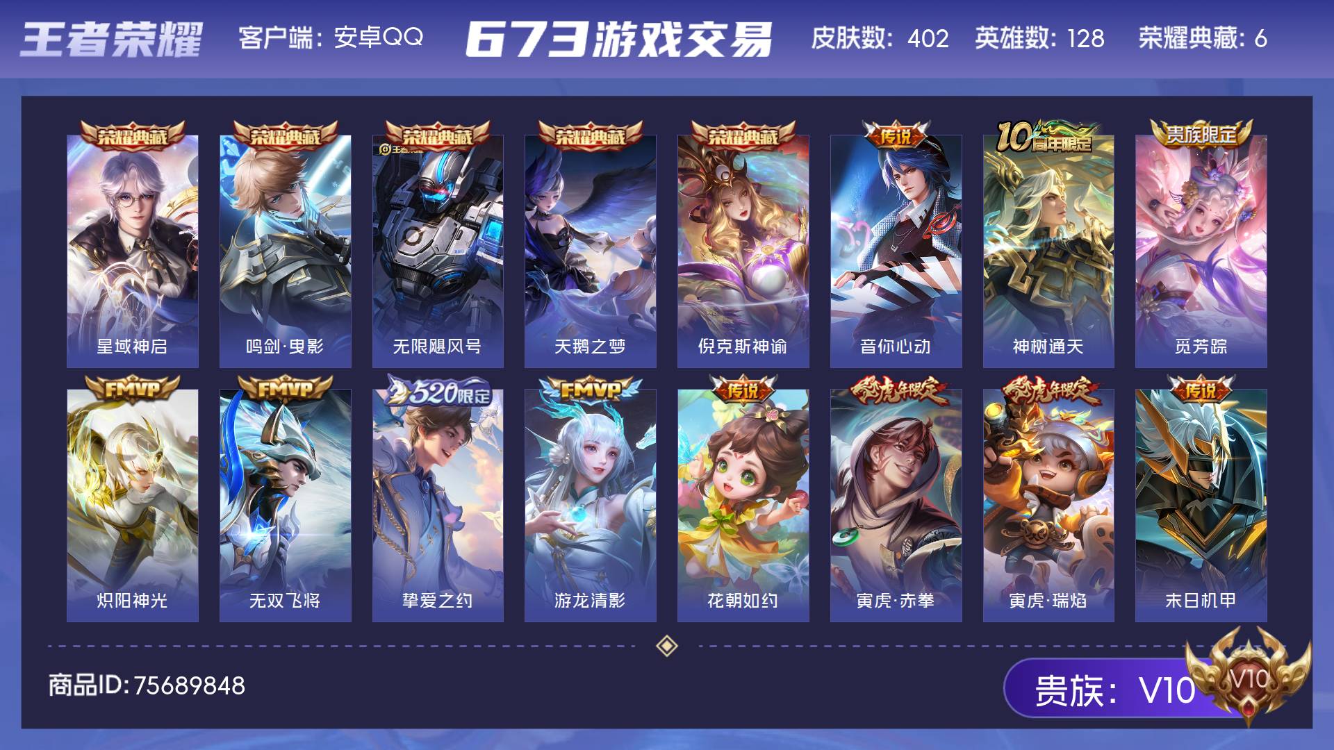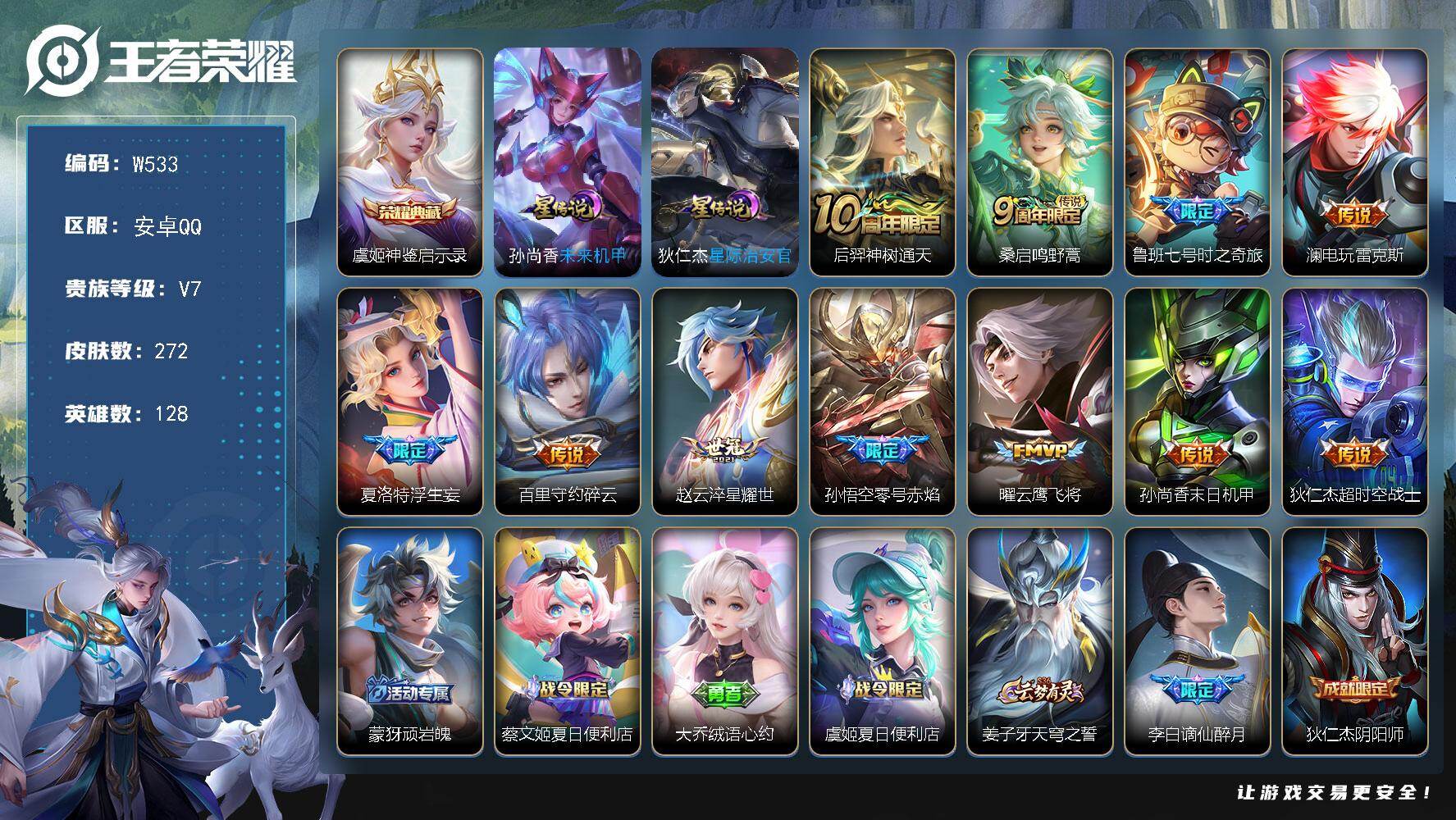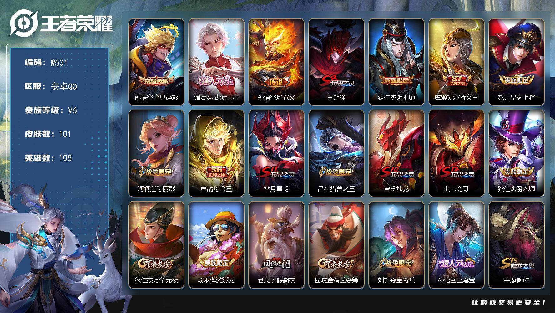 安卓QQ-2典藏-6传说-267皮肤-127英雄-绝世王者-鸣剑曳影 武则天 凤求凰 白虎志 云鹰飞将 大圣娶亲 一生所爱 青春决赛季 引擎之心 老号便宜甩