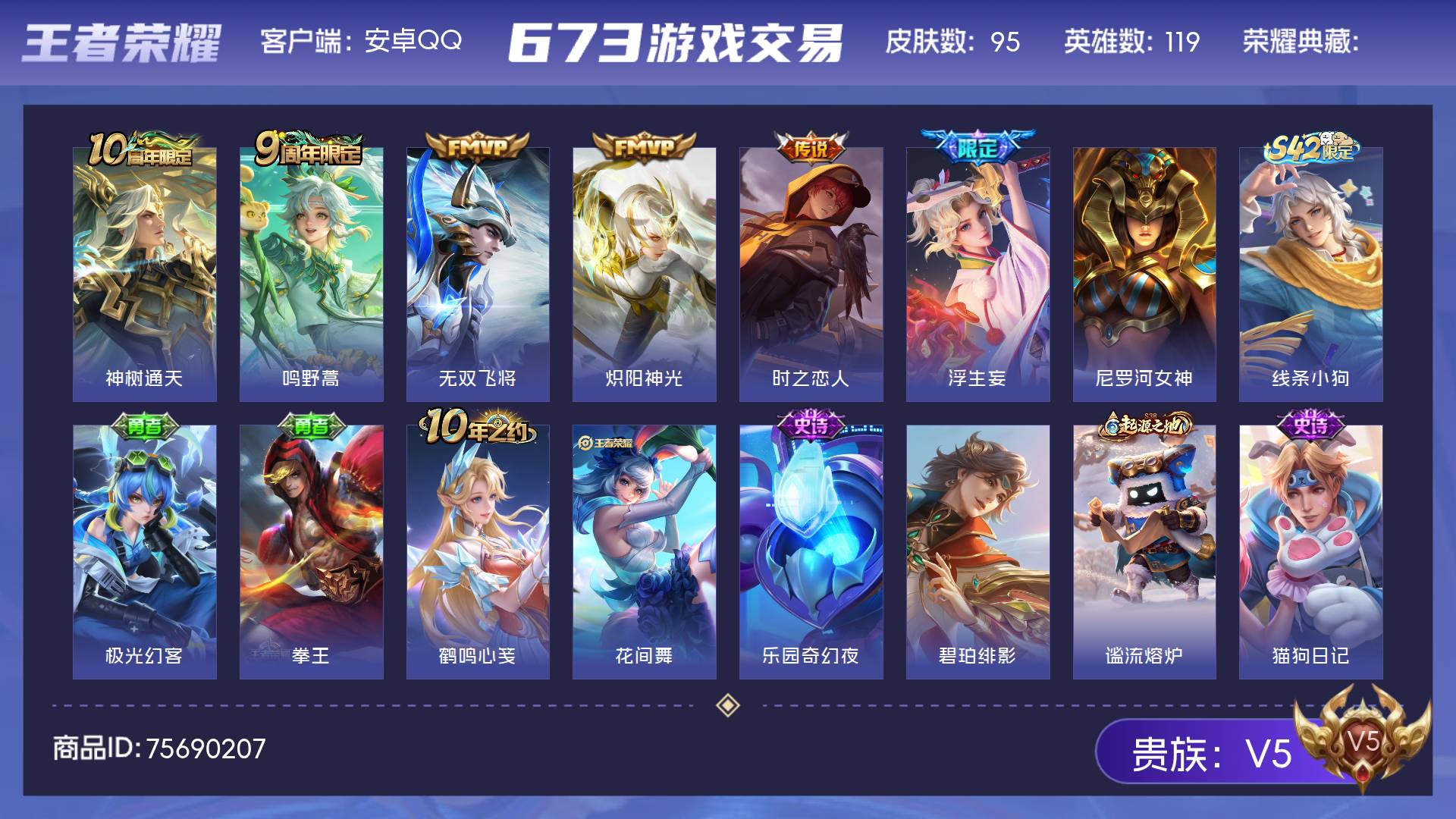 V5 皮肤95 英雄119 尊贵铂金 传说6 其他皮肤95