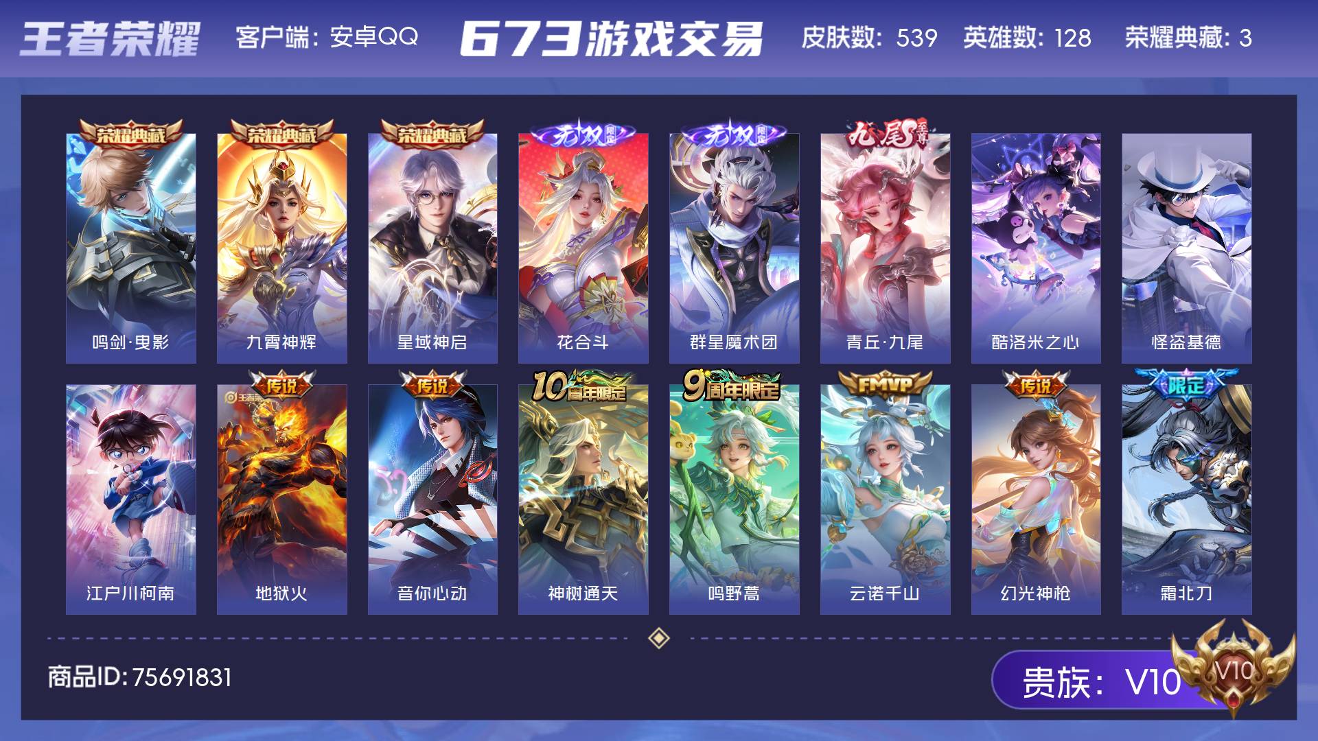 V10 皮肤539 英雄128 非凡王者 荣耀典藏3 无双皮肤3 珍品传说3 传说85 其他皮肤450
