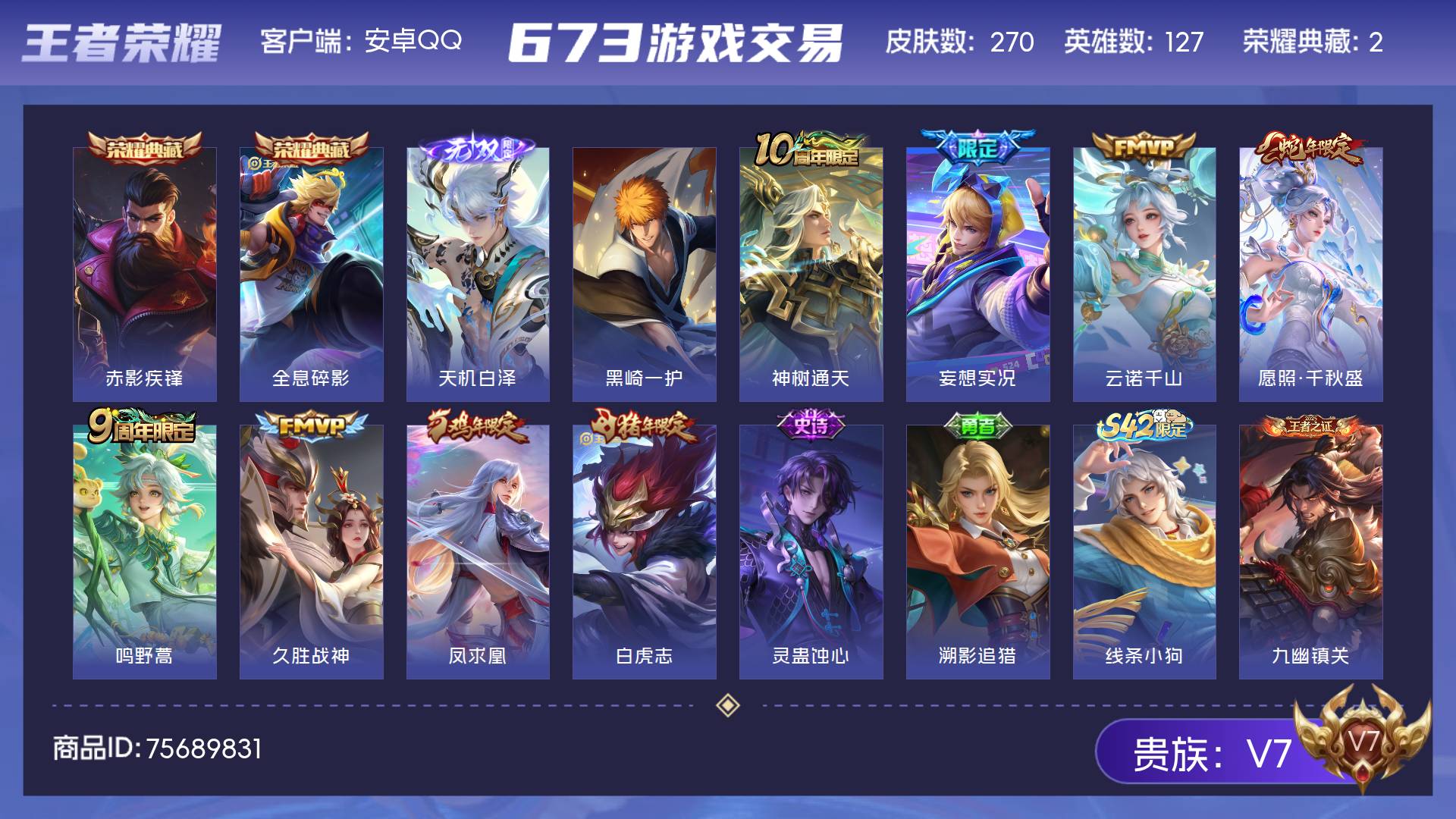 V7 皮肤270 英雄127 最强王者 荣耀典藏2 无双皮肤1 珍品传说1 传说8 其他皮肤264