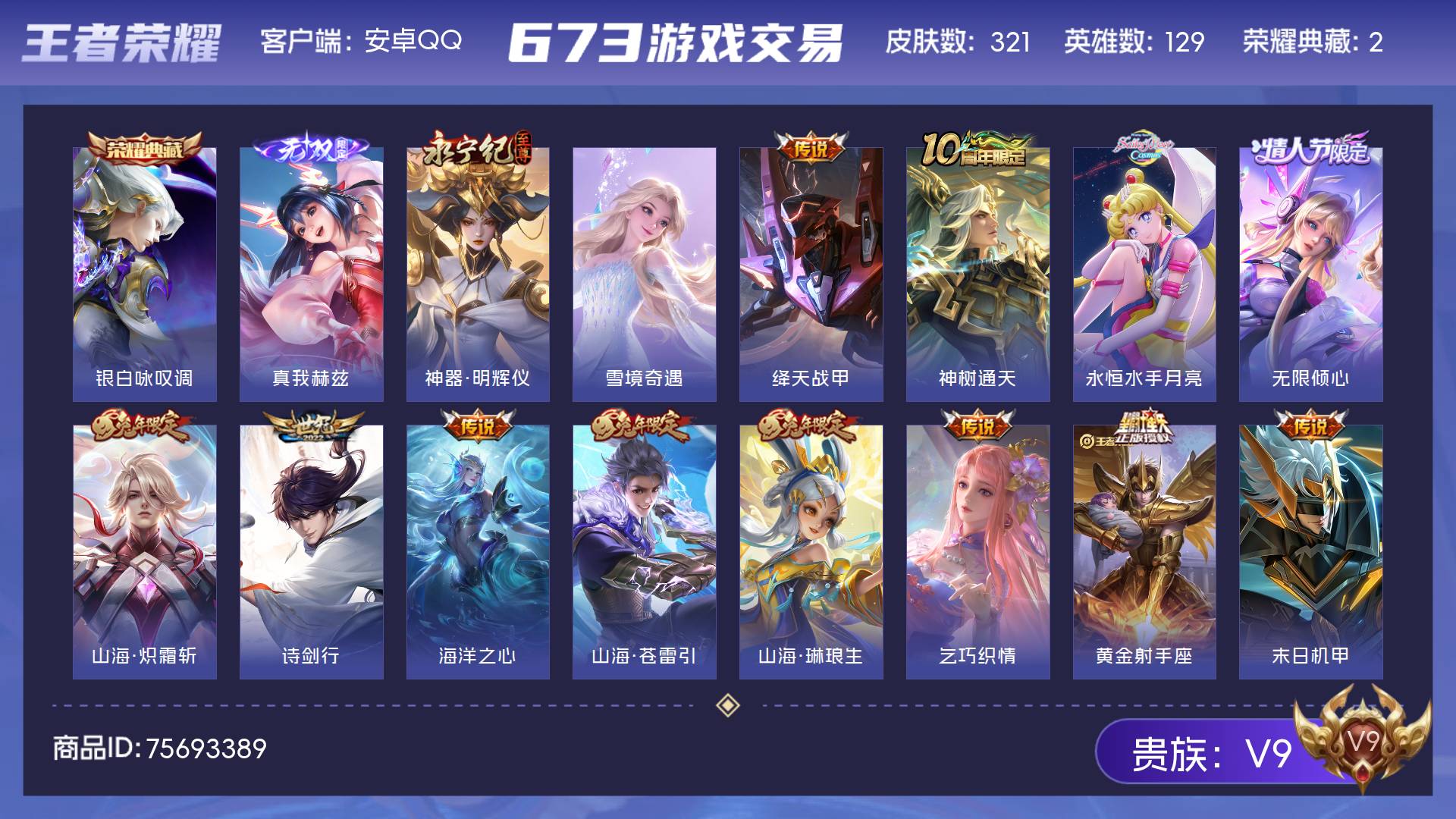 V9 皮肤321 英雄129 至尊星耀 荣耀典藏2 无双皮肤3 传说26 其他皮肤295
