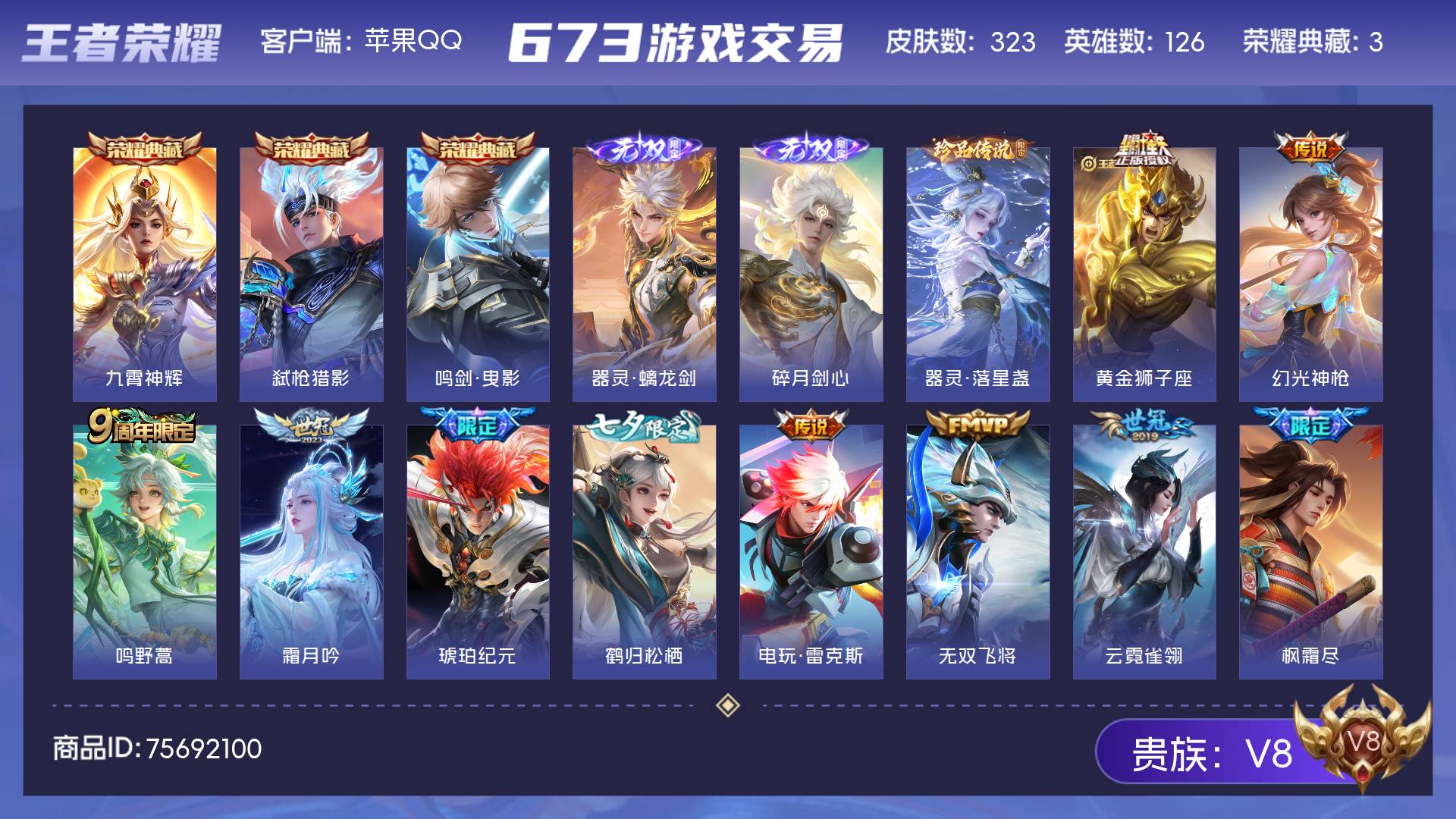 V8 皮肤323 英雄126 尊贵铂金 荣耀典藏3 无双皮肤2 珍品传说1 传说21 其他皮肤302