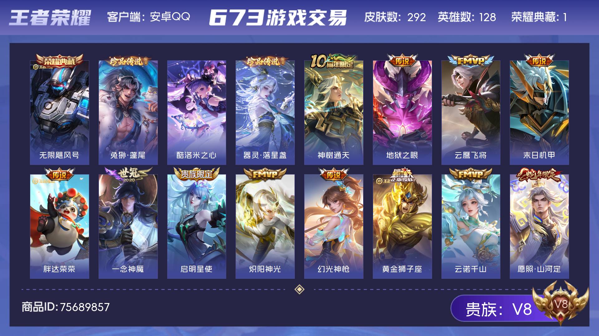 V8 皮肤292 英雄128 至尊星耀 荣耀典藏1 珍品传说3 传说14 其他皮肤278