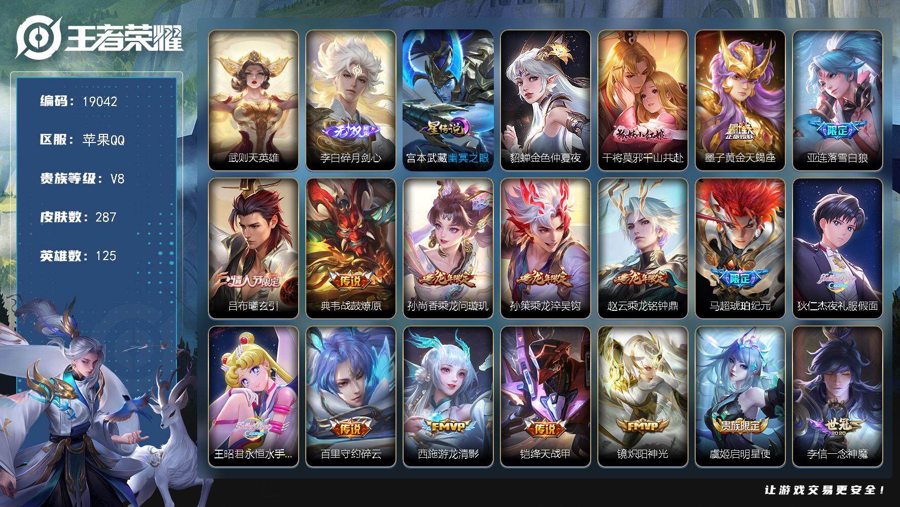 苹果QQ/最强王者/408皮肤/127英雄/4典藏/0珍品无双/1无双/1珍品传说/24传说/121