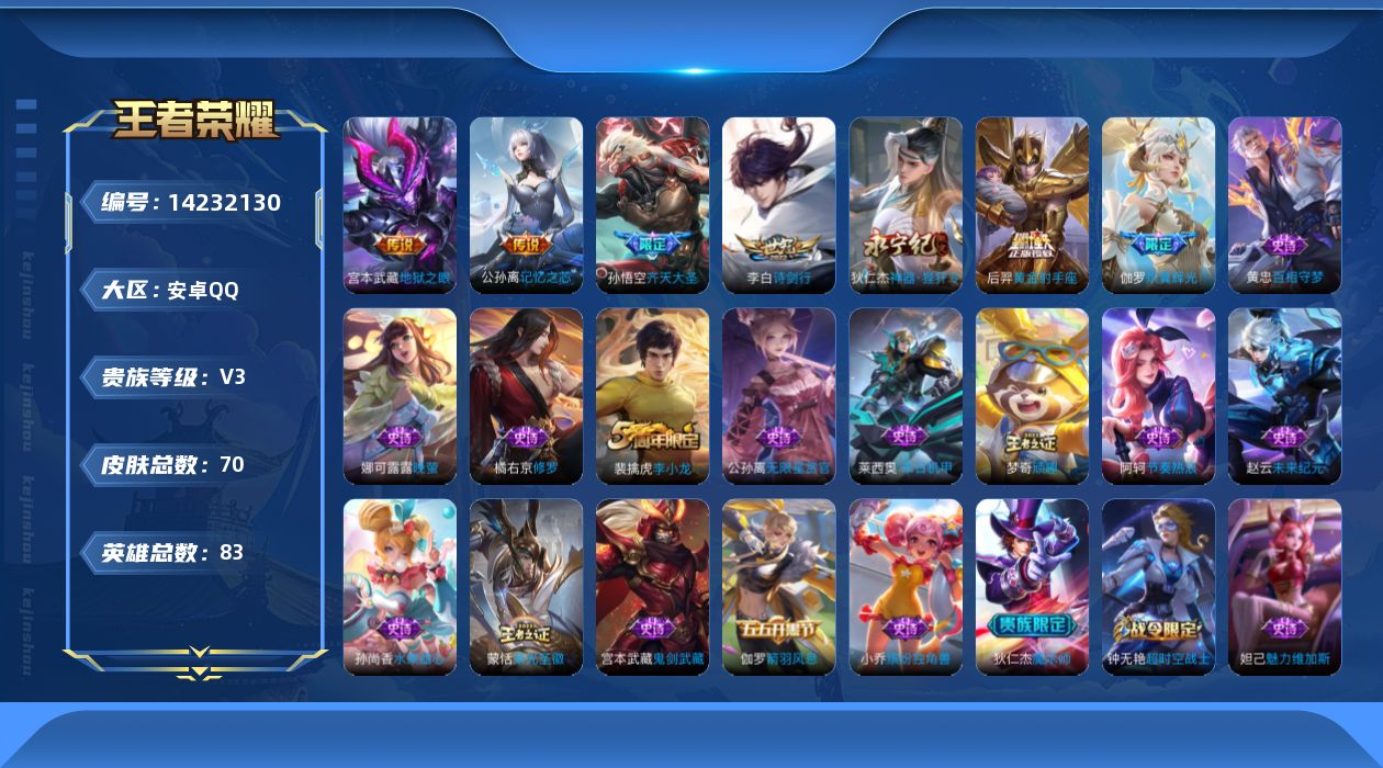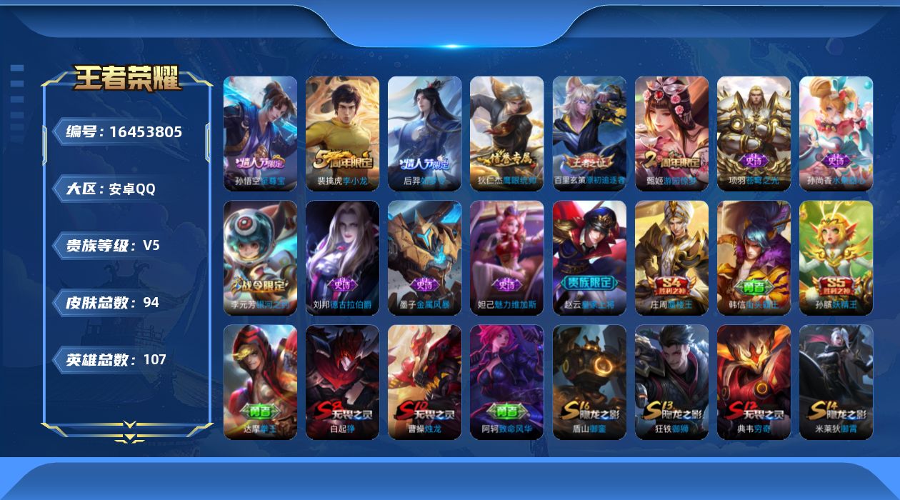 【蛇年限定全套 金标孙悟空】实名: 可修改 贵族等级: V10 英雄数: 12
