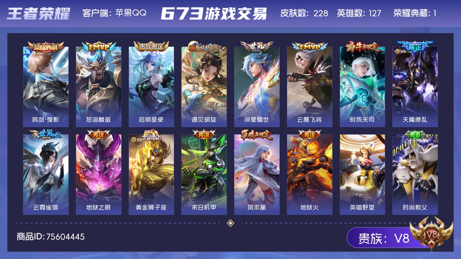 V8 皮肤228 英雄127 尊贵铂金 荣耀典藏1 传说14 其他皮肤219