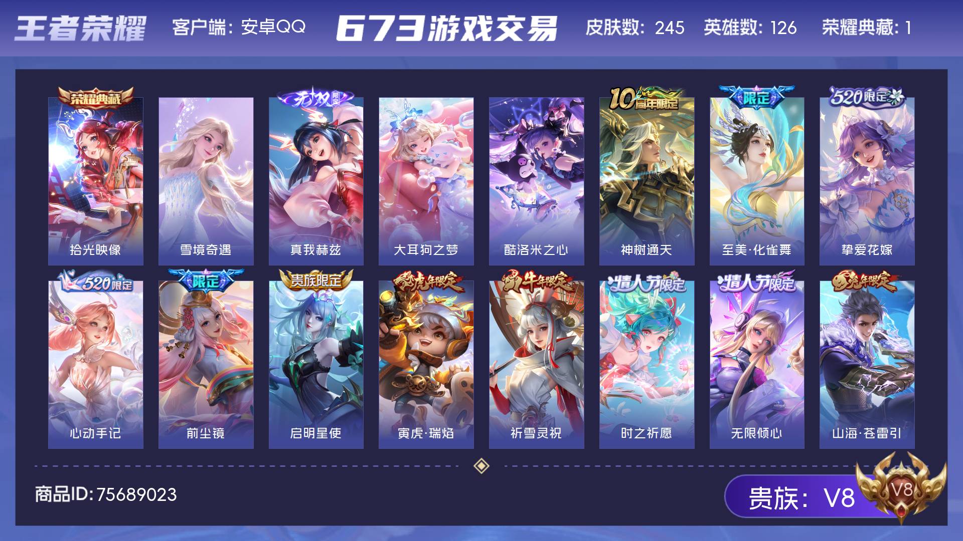 V8 皮肤245 英雄126 永恒钻石 荣耀典藏1 无双皮肤2 珍品传说2 传说23 其他皮肤222