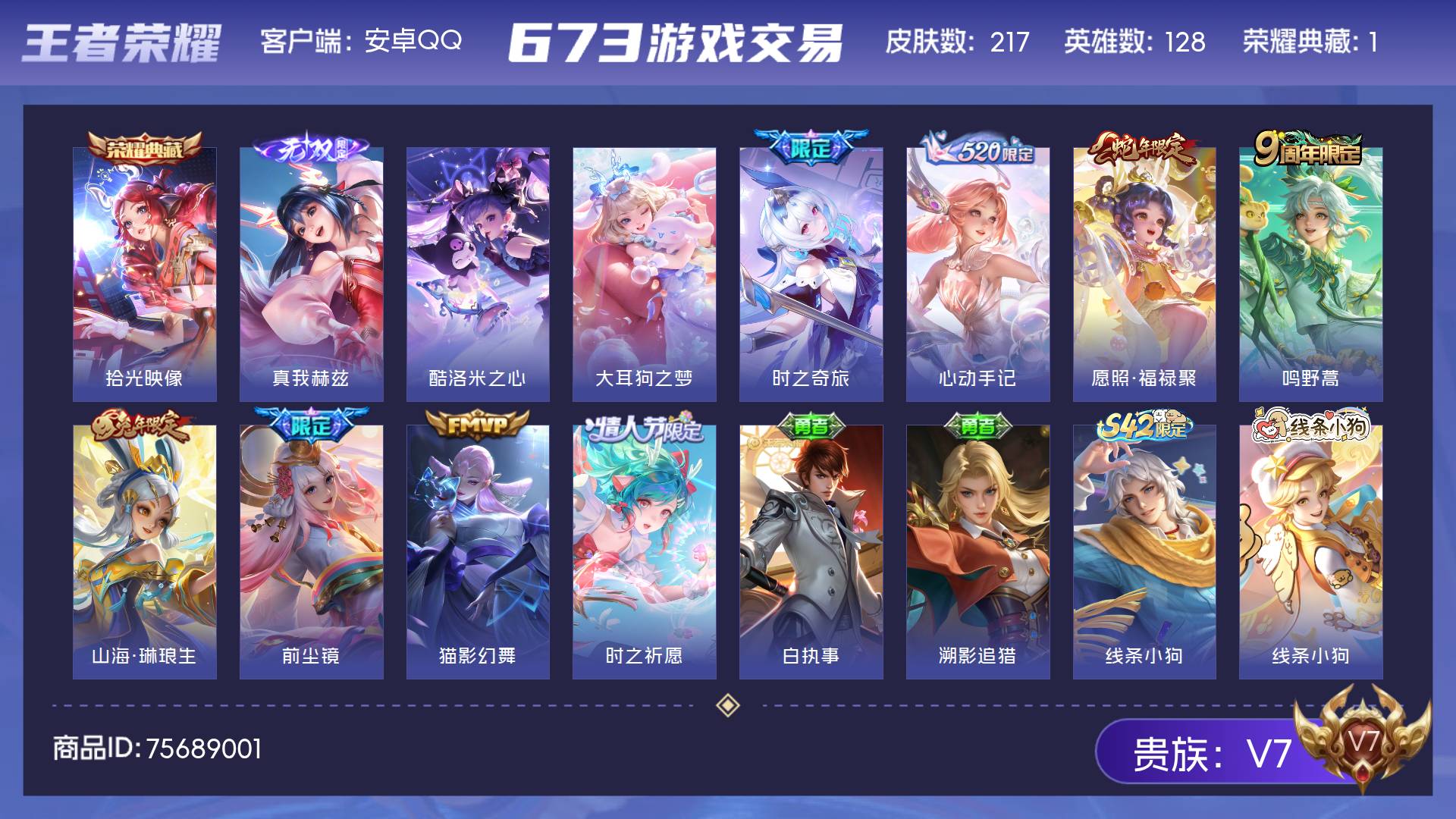 V7 皮肤217 英雄128 至尊星耀 荣耀典藏1 无双皮肤1 珍品传说2 传说8 其他皮肤210