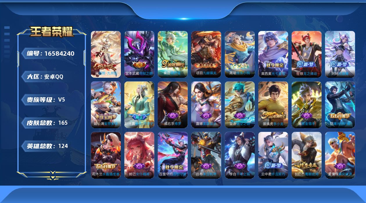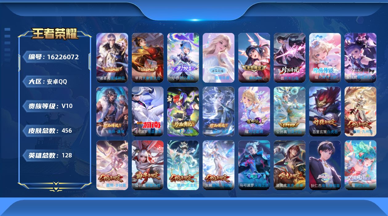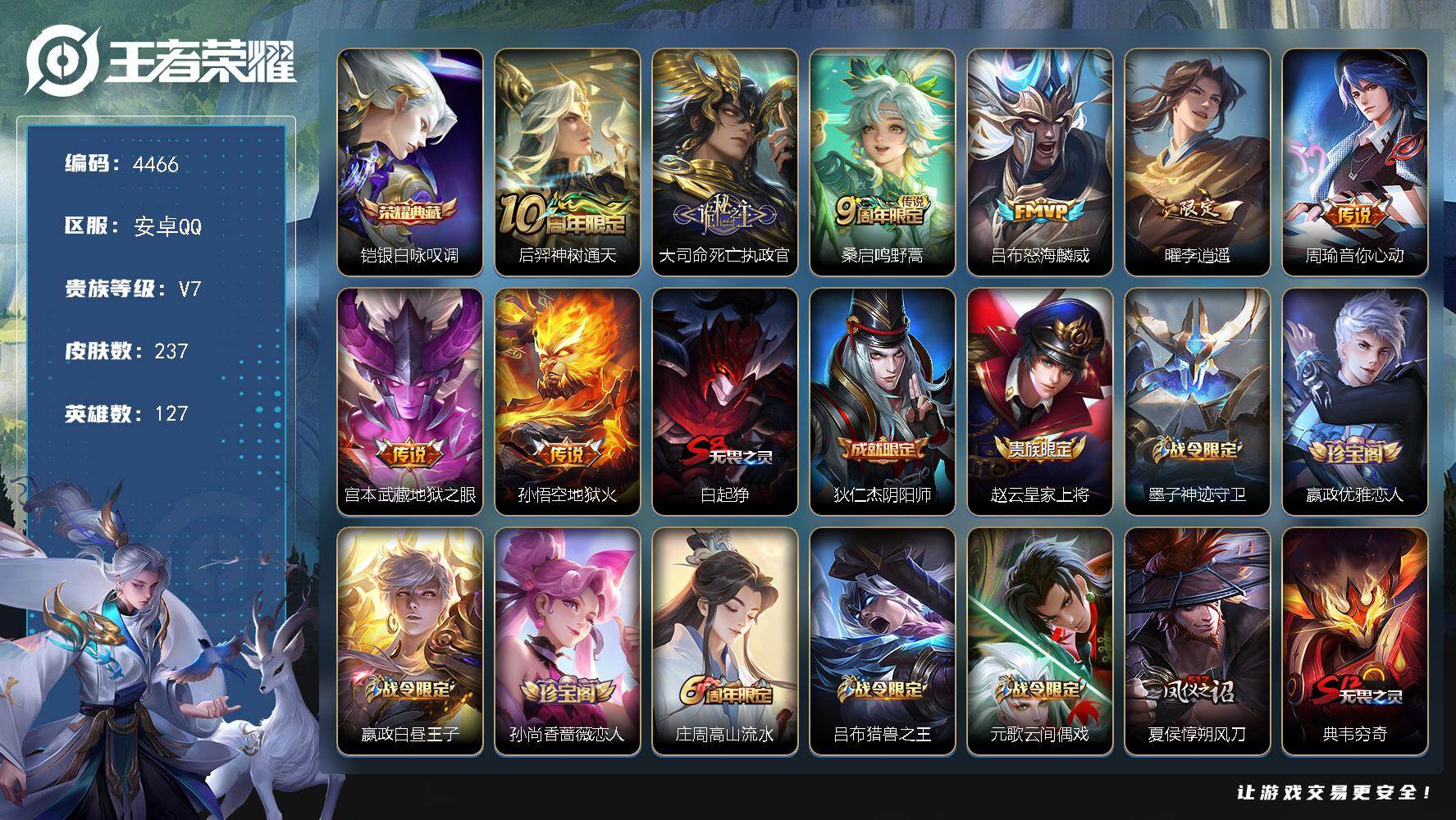 安卓Q-V7-尊贵铂金IV段位-127英雄-237皮肤-1典藏皮肤-8传说-6