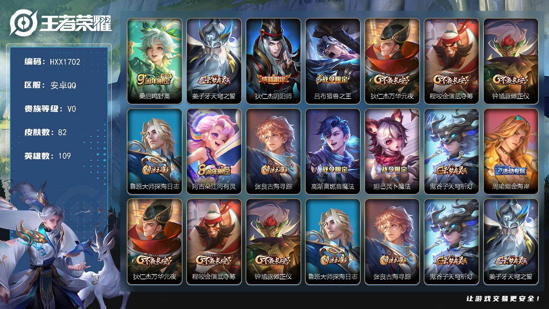 【HXX1702】贵族0/皮肤82/传说1/史诗18/英雄109/桑启-鸣野蒿