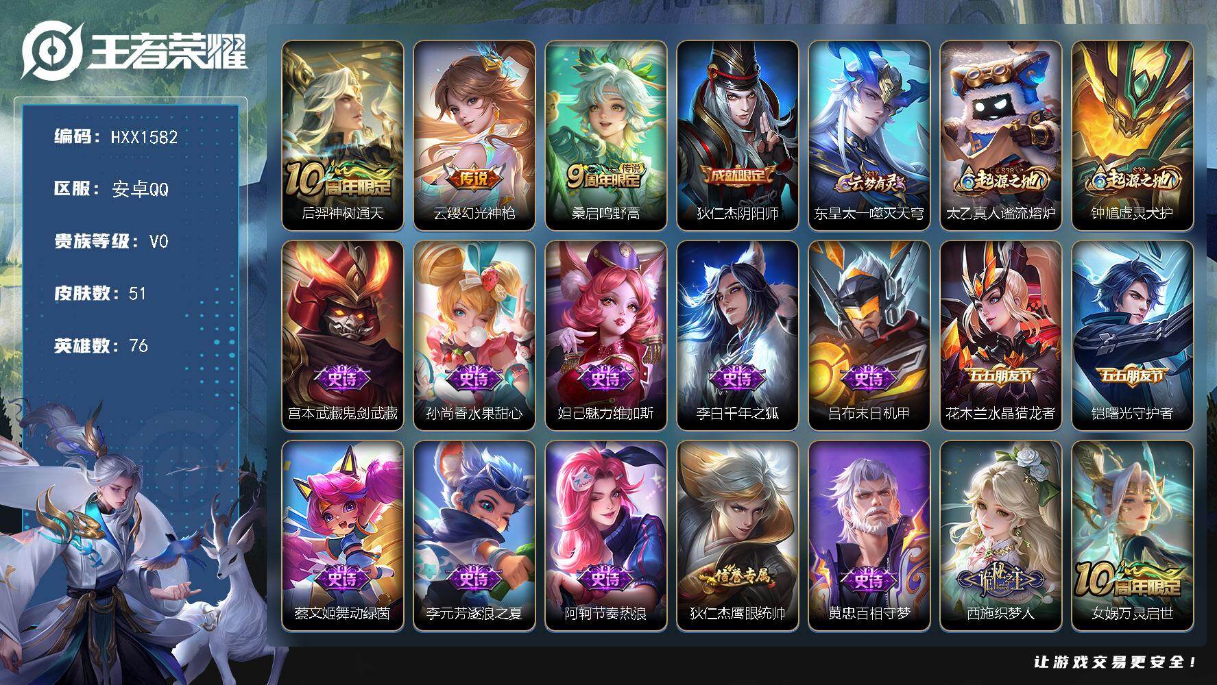 【HXX1582】贵族0/皮肤51/传说3/史诗14/英雄76/后羿神树通天/