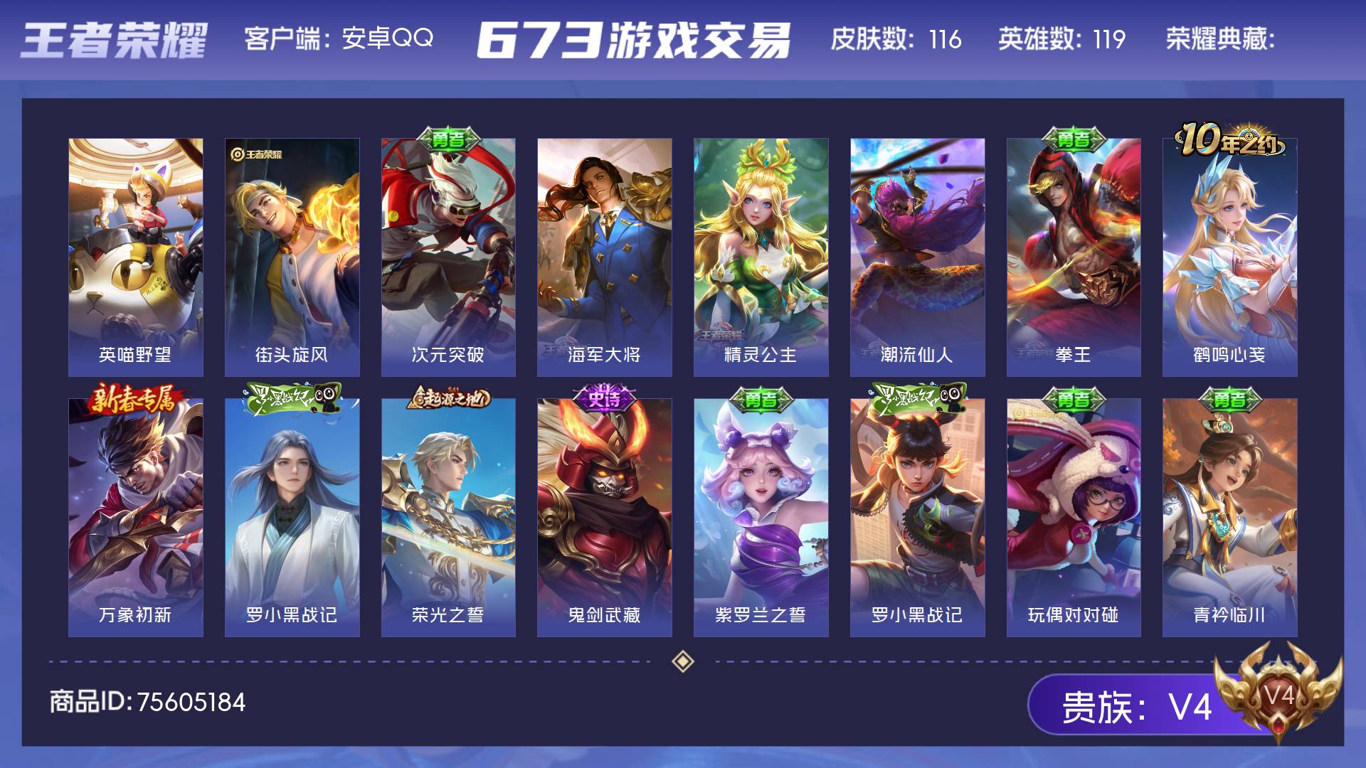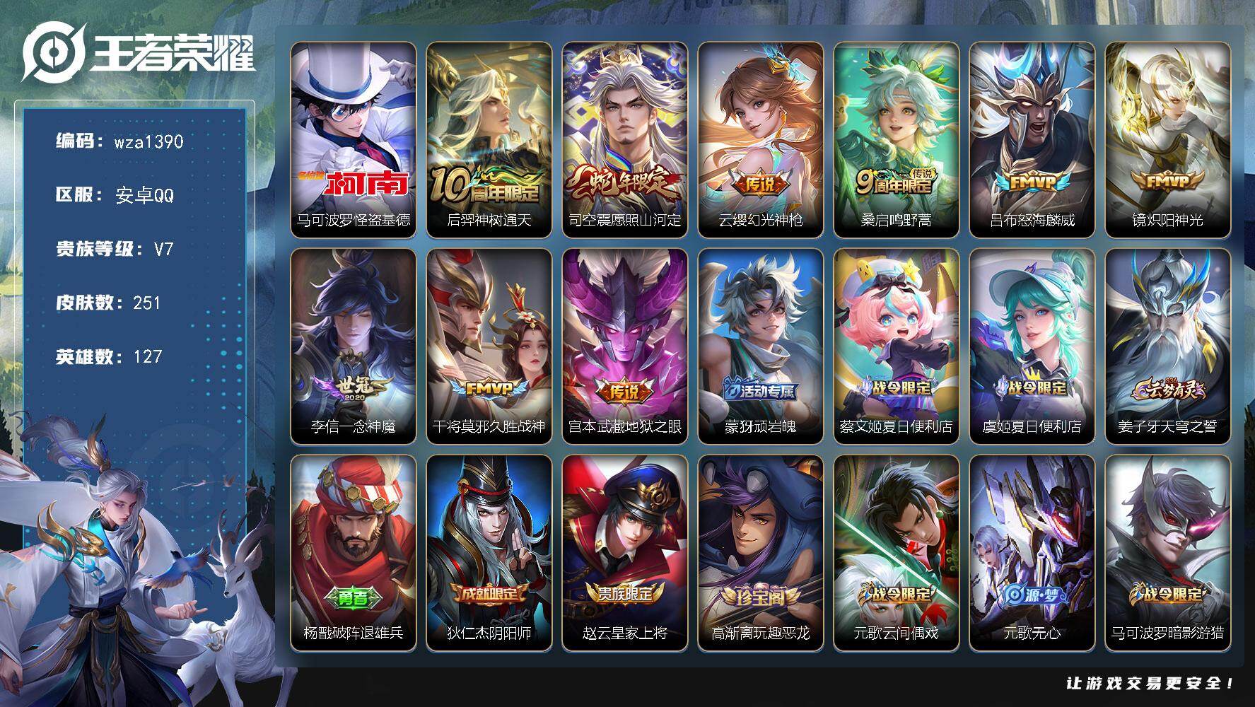 安卓Q-V7-至尊星耀III段位-127英雄-251皮肤-1珍品传说-9传说-70史诗