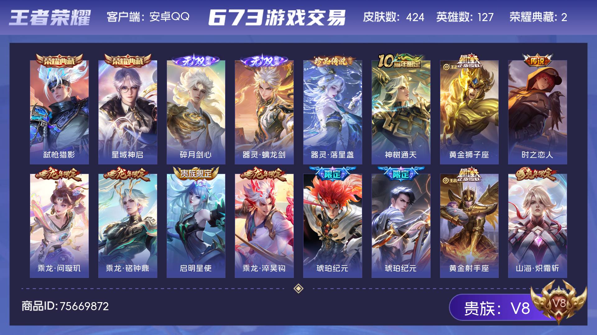 V8 皮肤424 英雄127 永恒钻石 荣耀典藏2 无双皮肤2 珍品传说1 传说25 其他皮肤398