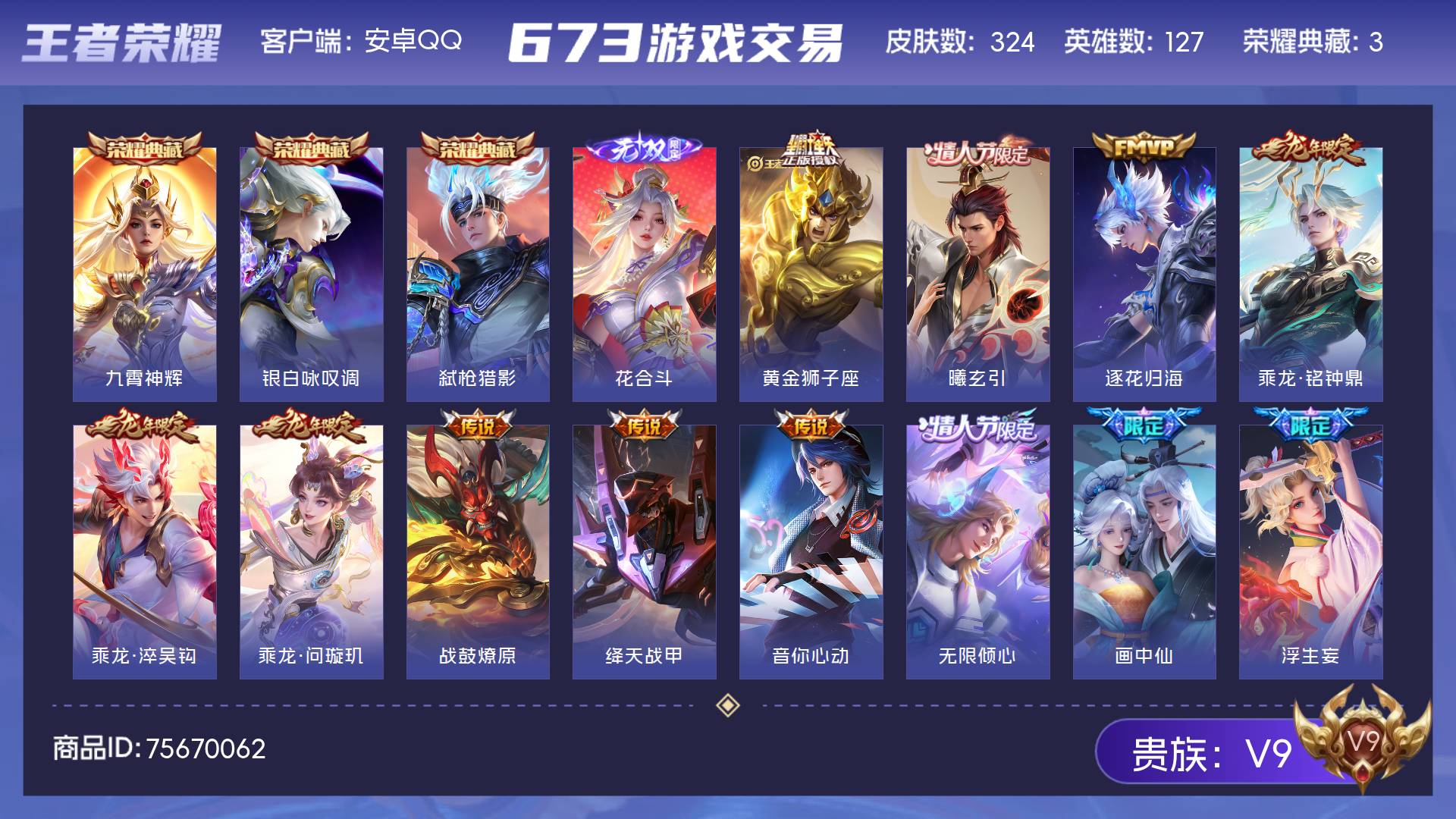 V9 皮肤324 英雄127 至尊星耀 荣耀典藏3 无双皮肤1 传说35 其他皮肤290