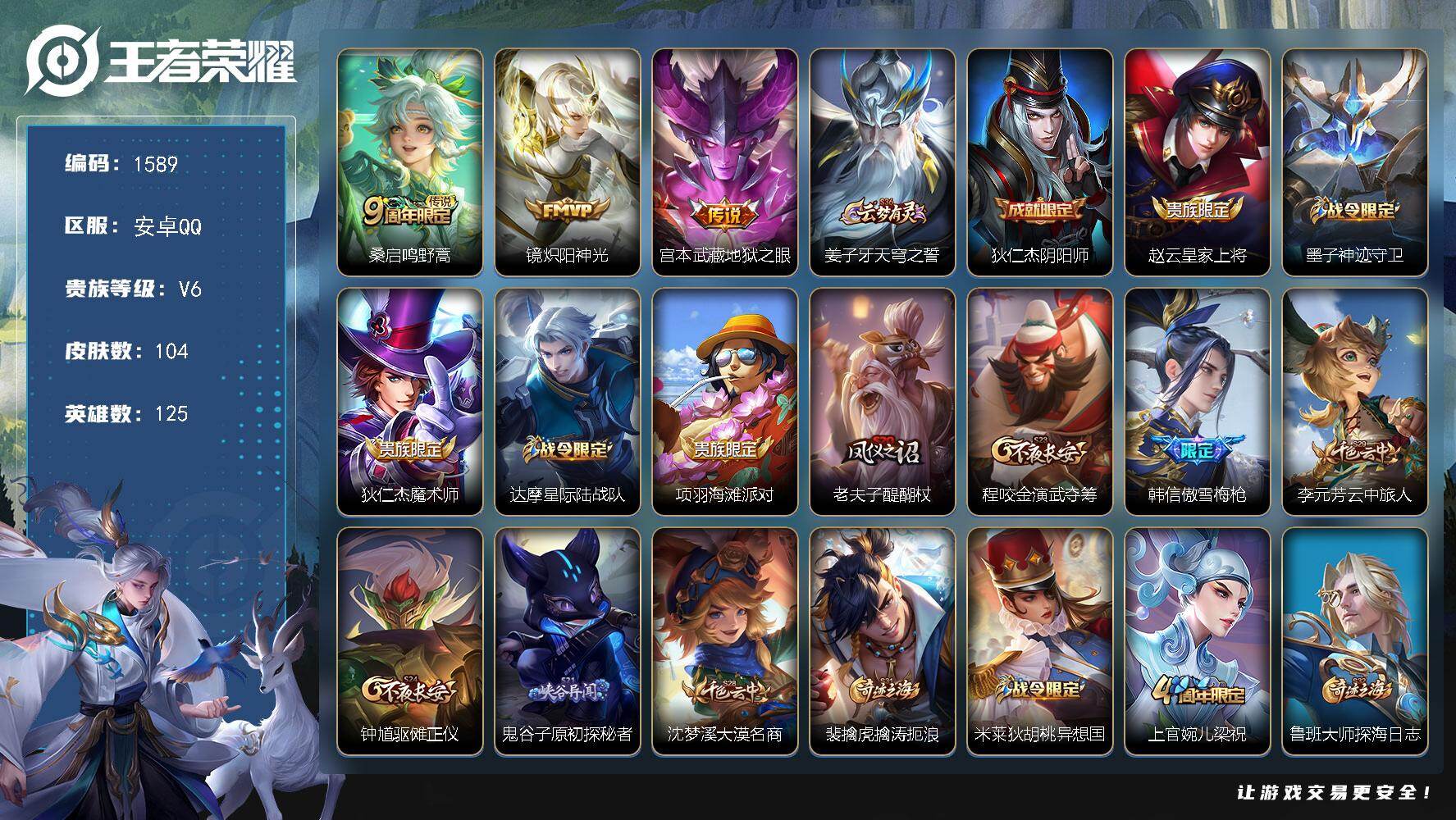 安卓WX-V6-至尊星耀IV段位-104英雄-87皮肤-3传说-32史诗【传