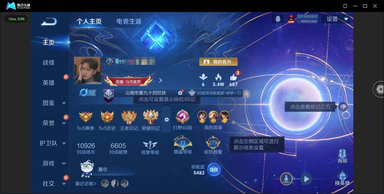 实名: 可修改 贵族等级: V6 英雄数: 125 皮肤数: 150 星传说: