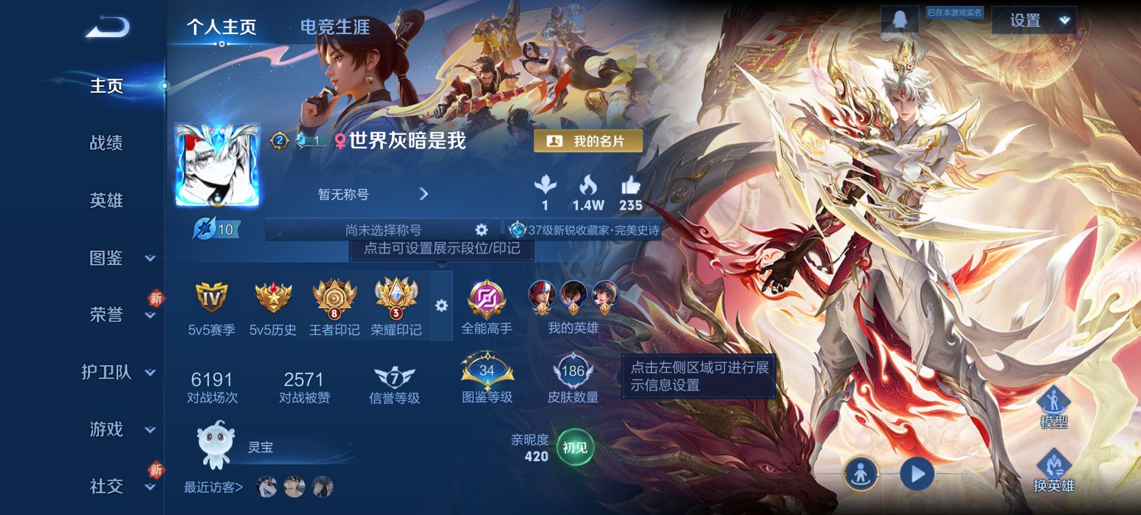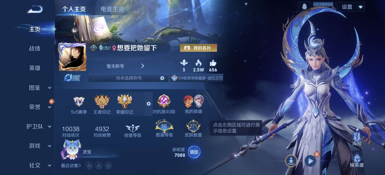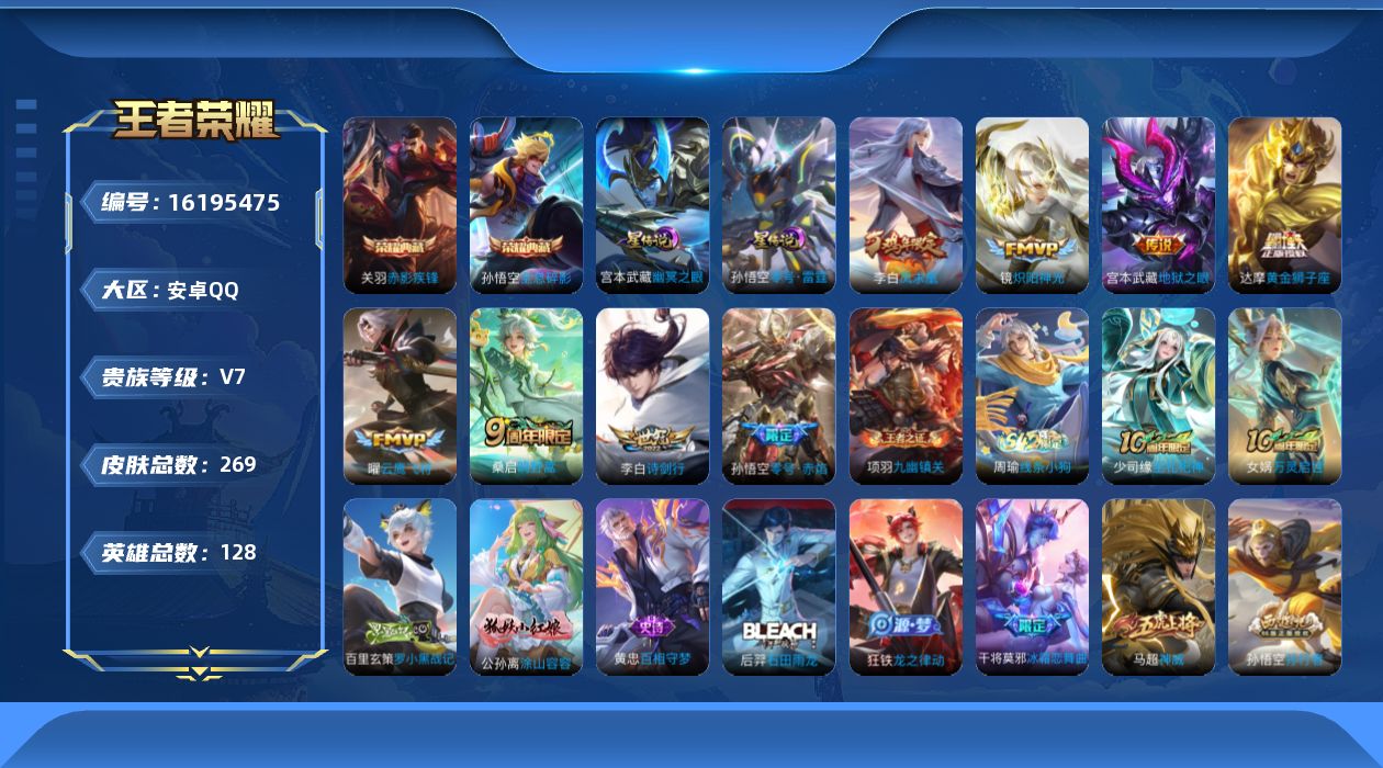 实名: 可修改 贵族等级: V7 英雄数: 126 皮肤数: 171 传说皮: