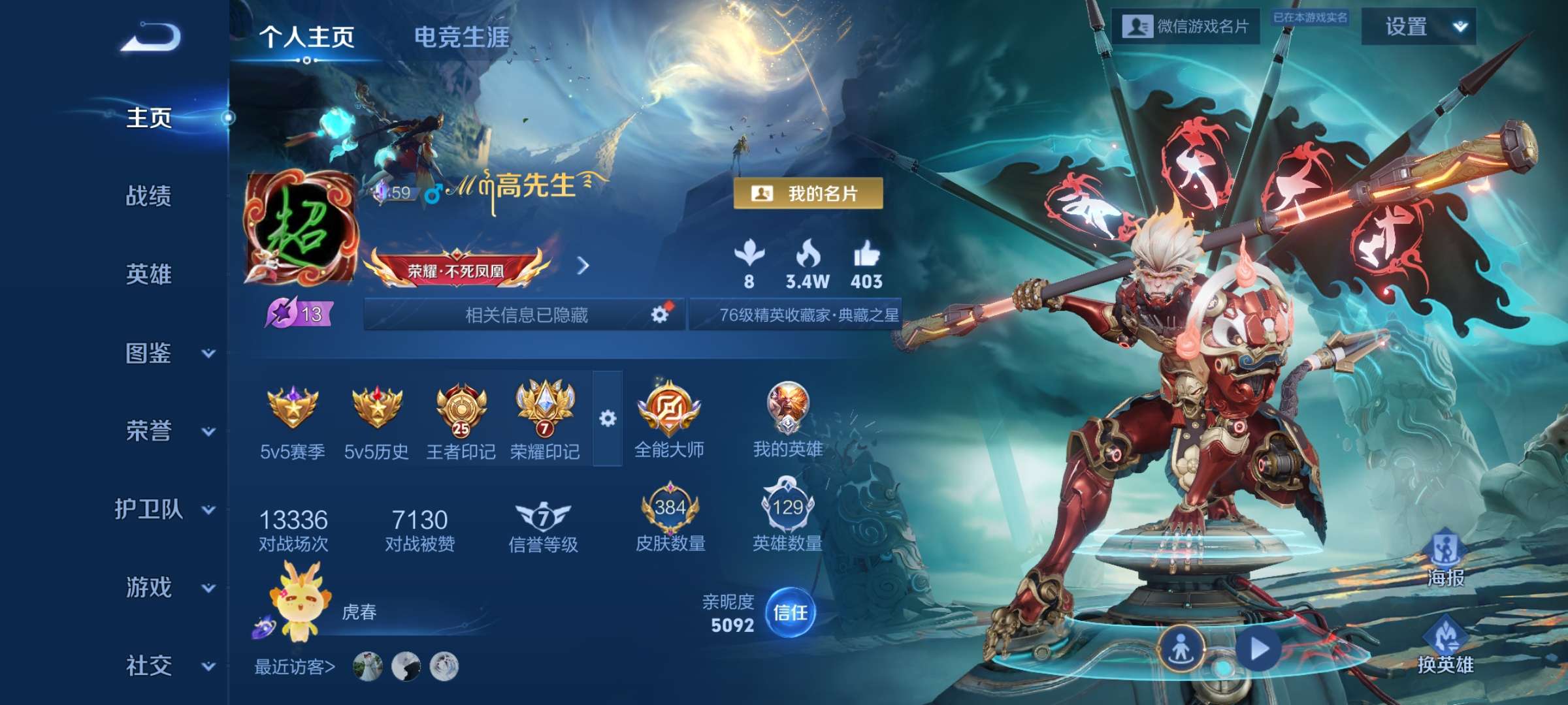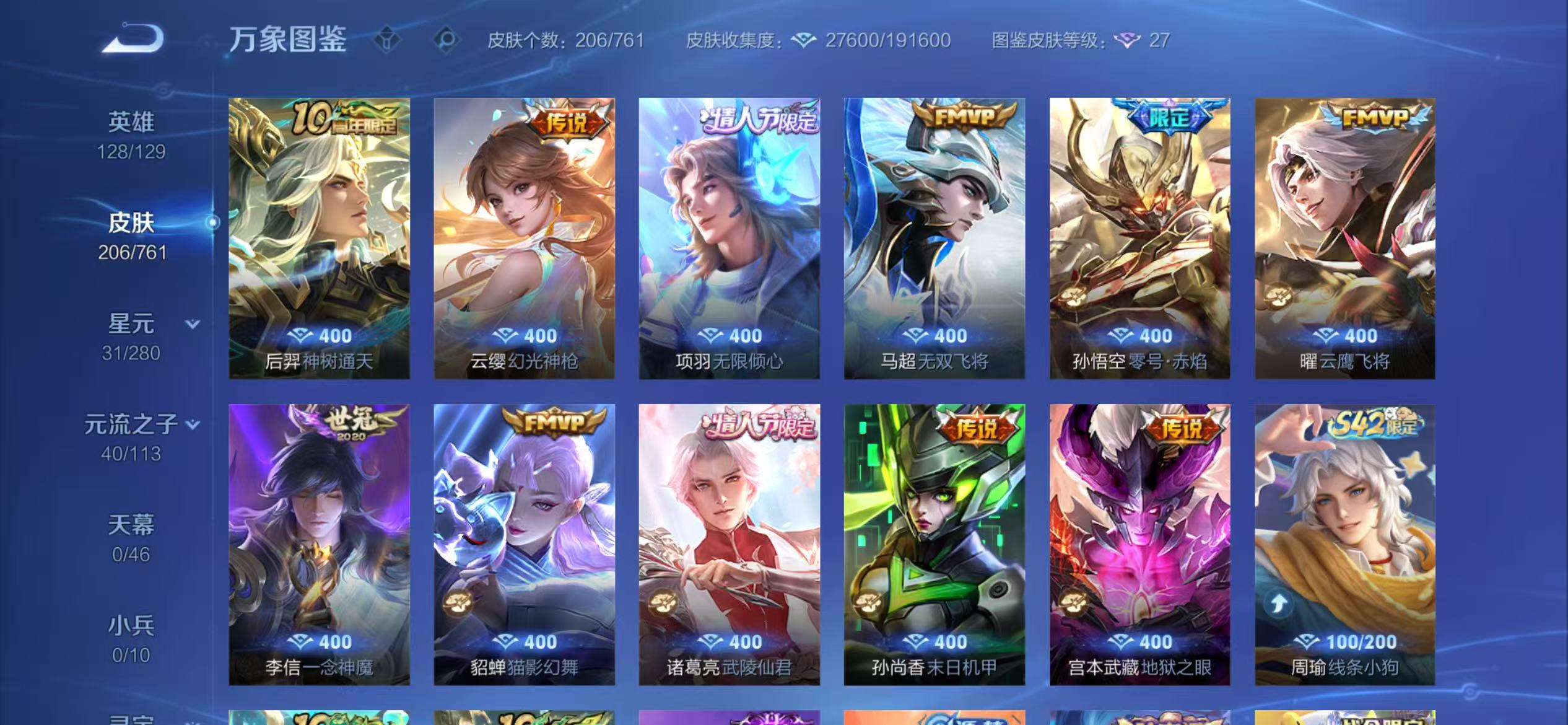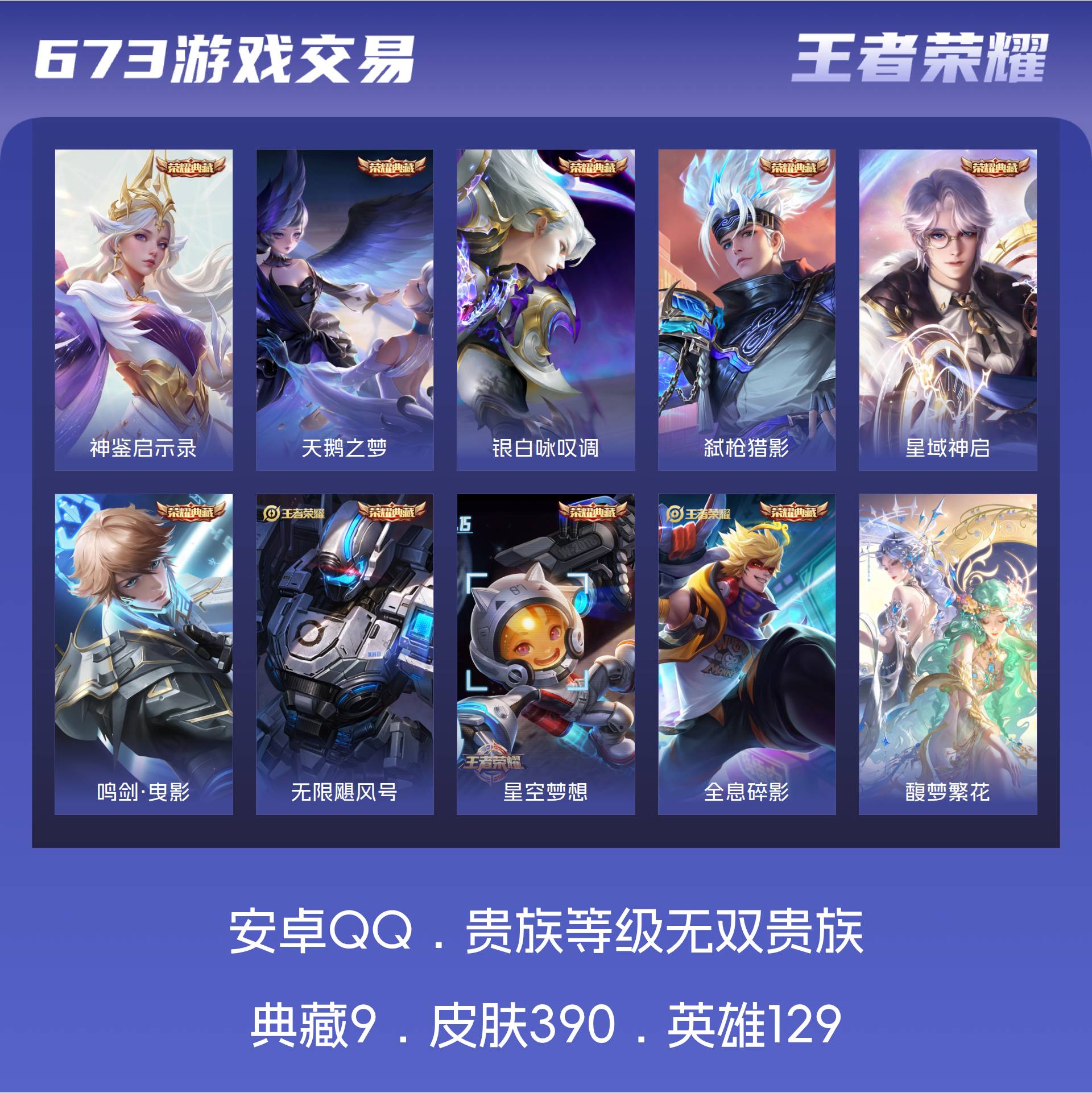 无双贵族 皮肤390 英雄129 至尊星耀 荣耀典藏9 珍品无双1 无双皮肤2 珍品传说2 传说39 其他皮肤343