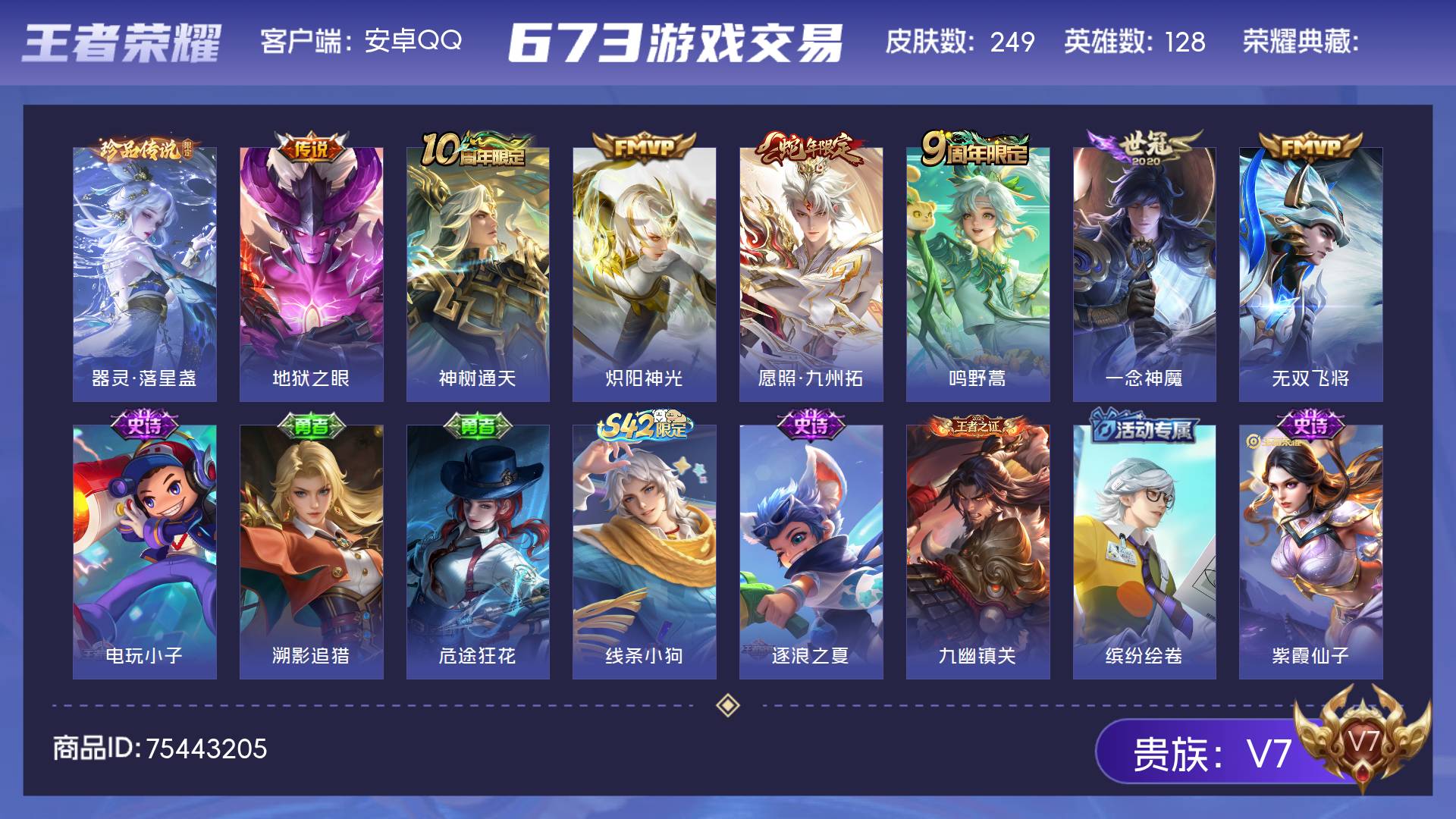 V7 皮肤249 英雄128 至尊星耀 珍品传说1 星传说2 传说8 其他皮肤244