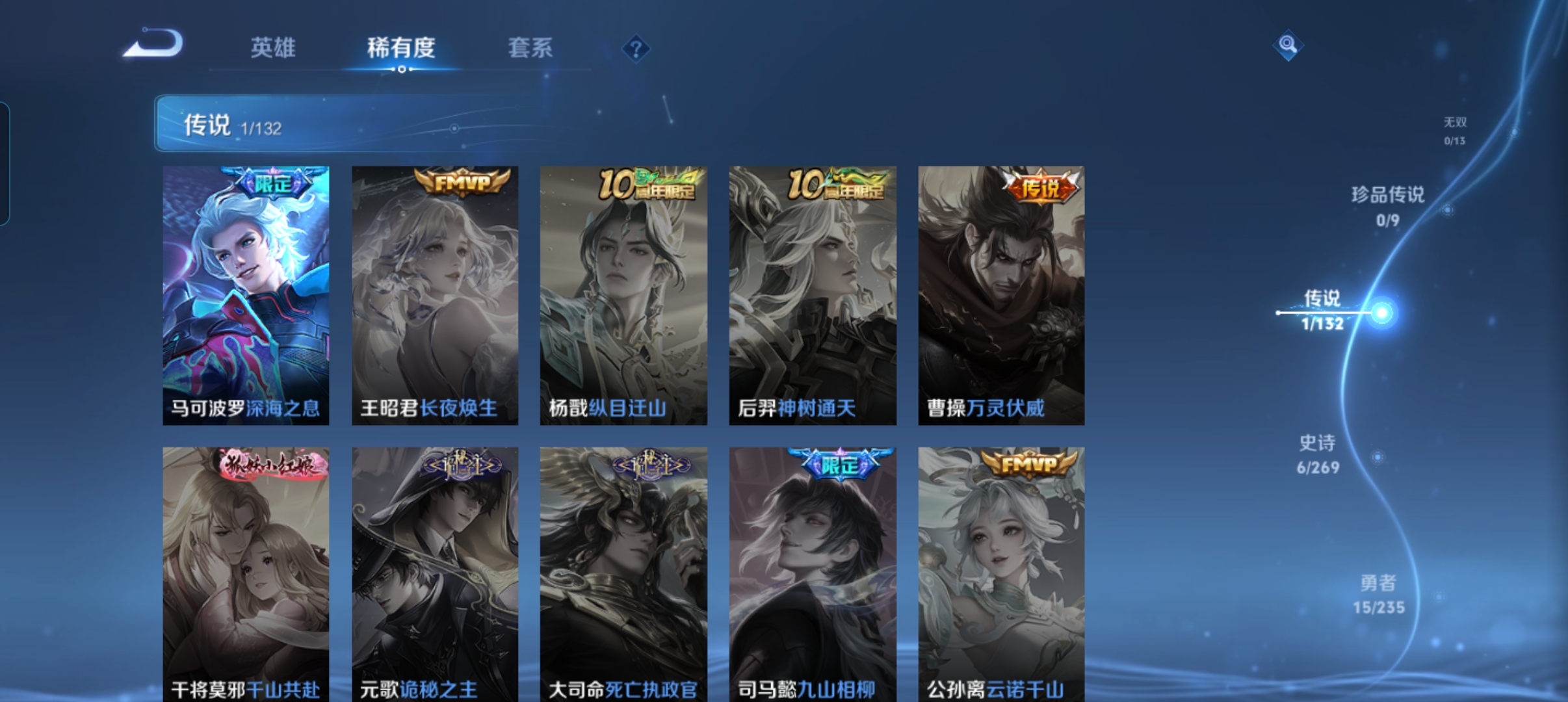 王者荣耀,贵八,122英雄,249皮肤,1典藏,1无双,17传说,1星传说,限定史诗一大堆