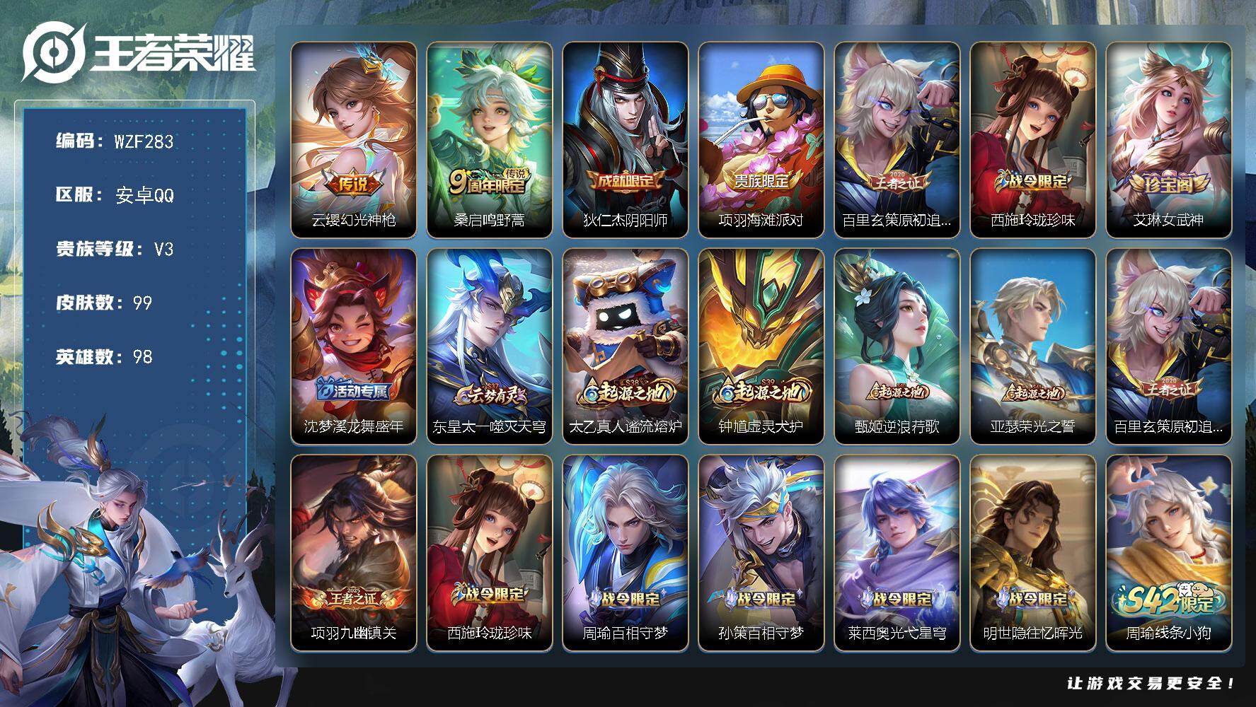 贵族3/皮肤99/传说2/史诗26/英雄98/孙权全皮/空空儿全皮/云缨-幻光神枪/桑启-鸣野蒿/狄仁杰-阴阳师/项羽-海滩派对/