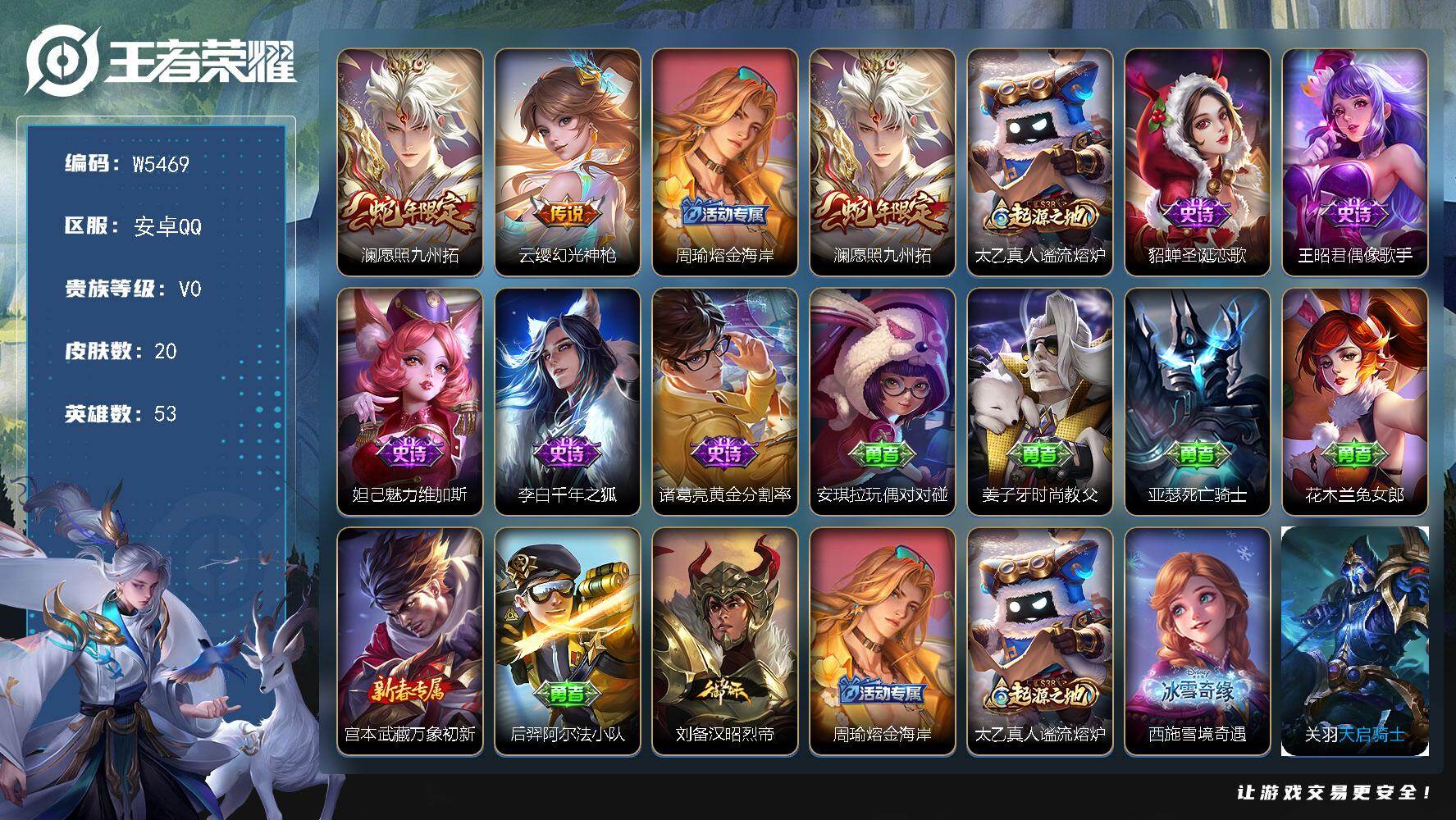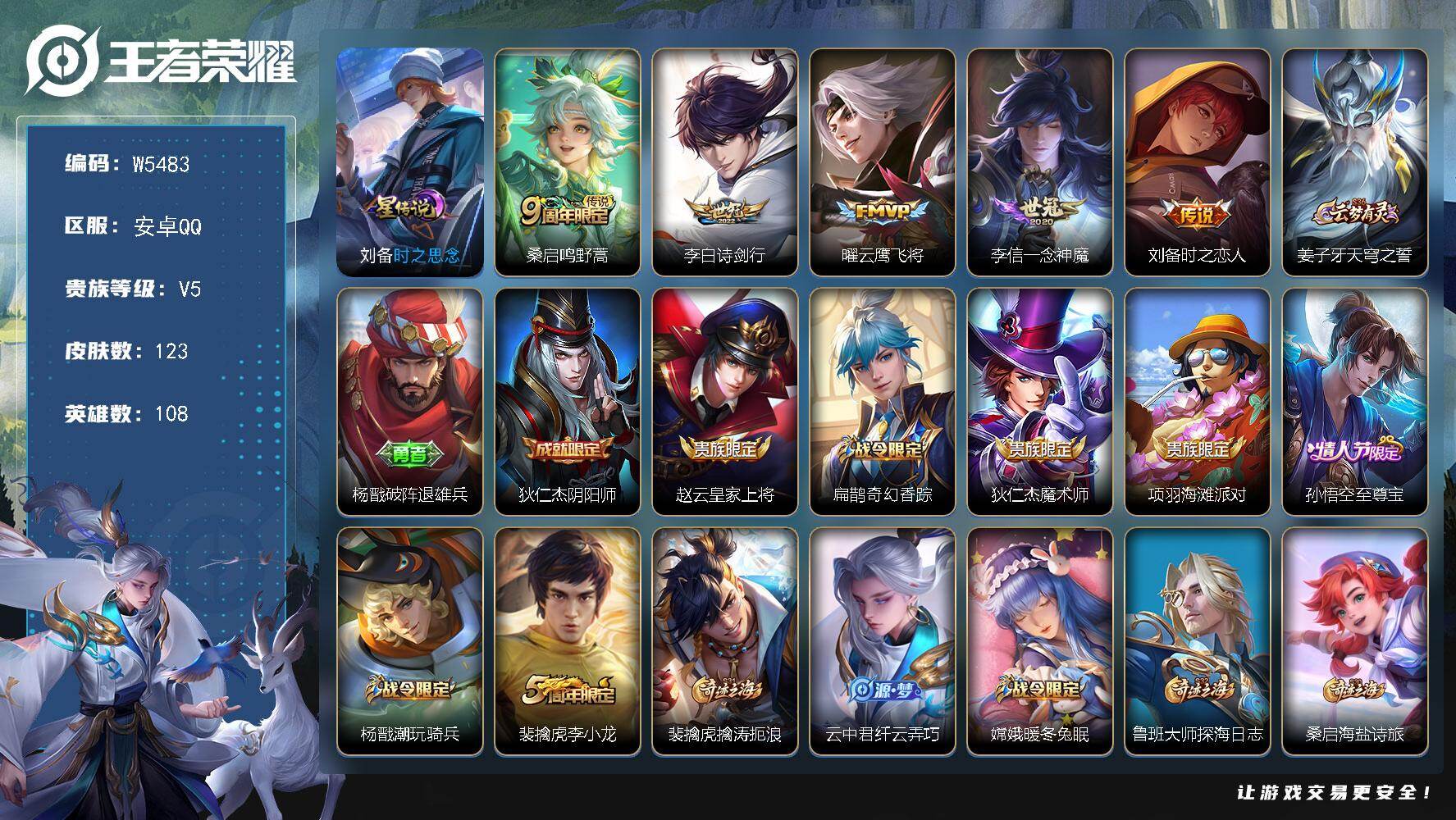【W5483】安卓Q区-可二次-贵6-108英雄-123皮肤-5传说-39史诗