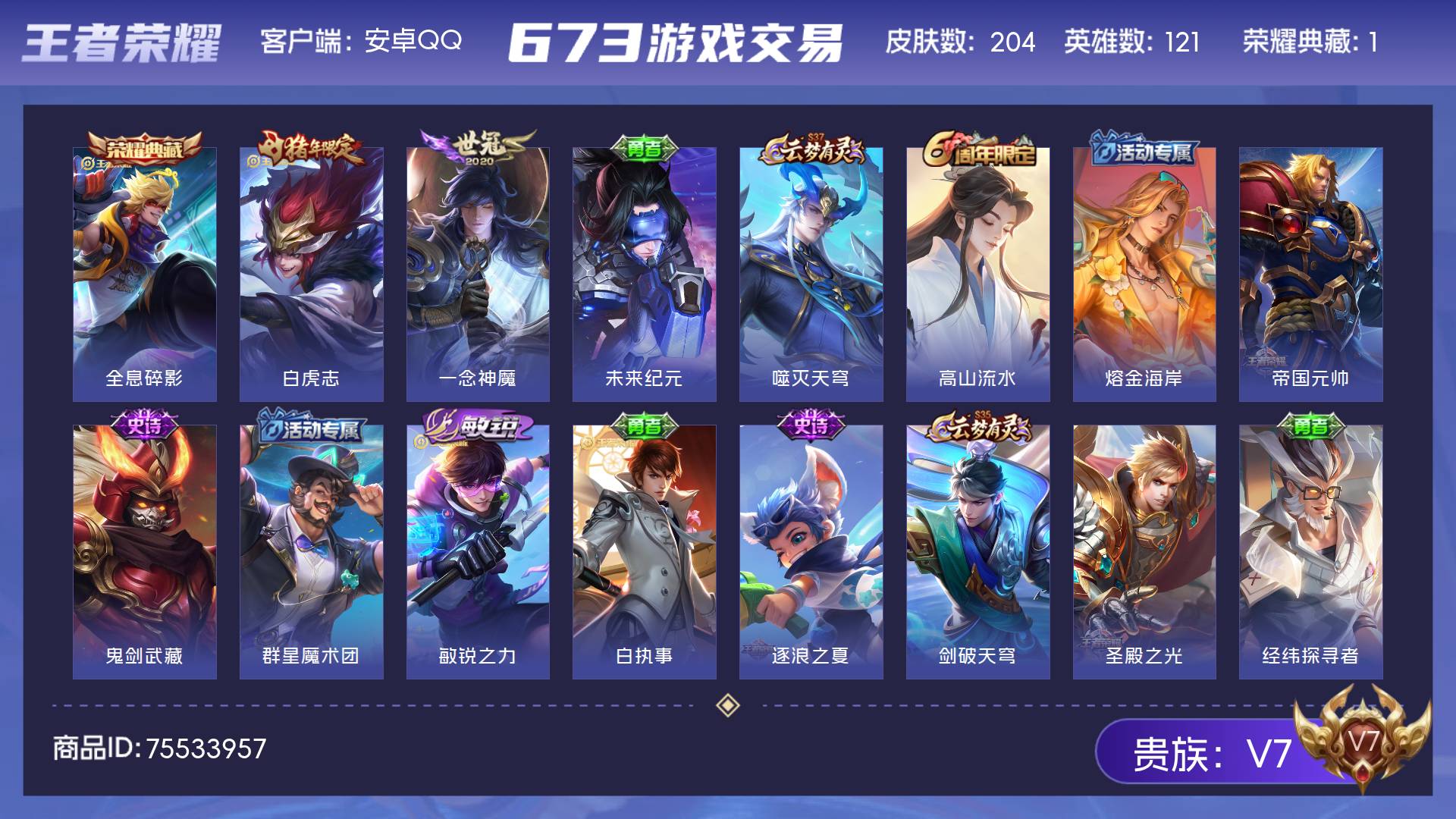 V7 皮肤204 英雄121 荣耀黄金 荣耀典藏1 传说3 其他皮肤206