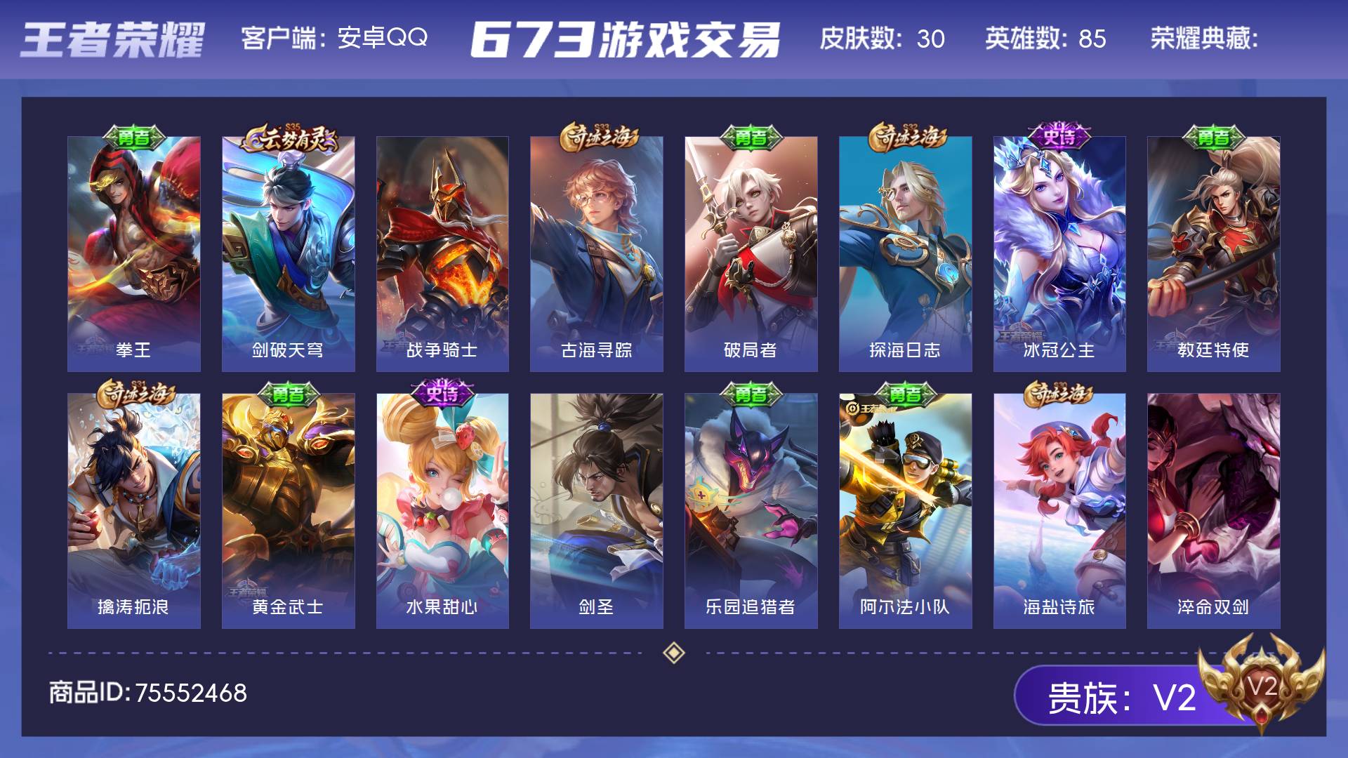 V2 皮肤30 英雄85 荣耀黄金 其他皮肤36