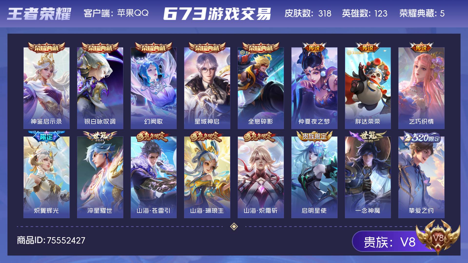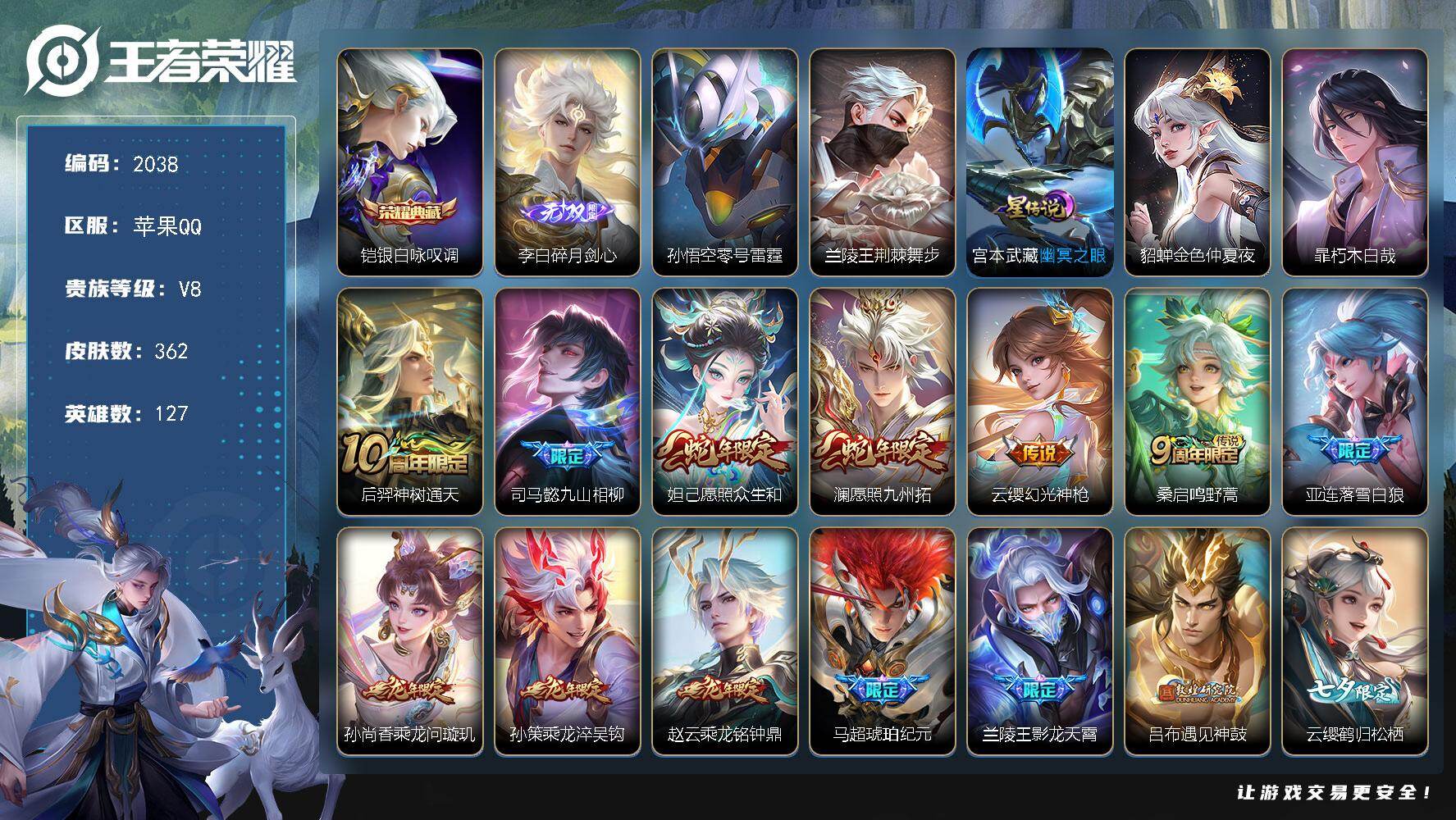 苹果Q-V8-永恒钻石V段位-127英雄-362皮肤-1典藏皮肤-1无双-1珍