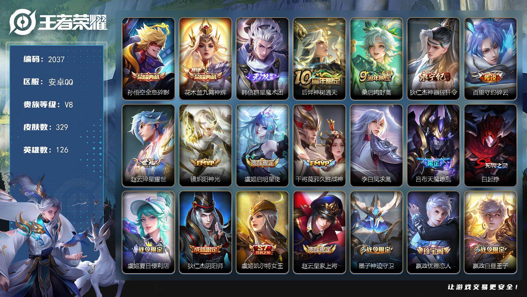 安卓Q-V8-永恒钻石II段位-126英雄-329皮肤-2典藏皮肤-1无双-1